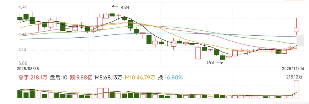 今天收盘价4.52,直接跨过了平台上沿(4.2左右),而且涨幅7.62%——不是“碰一下就掉”,是“大步跨上台阶”,稳稳站在了平台上面。