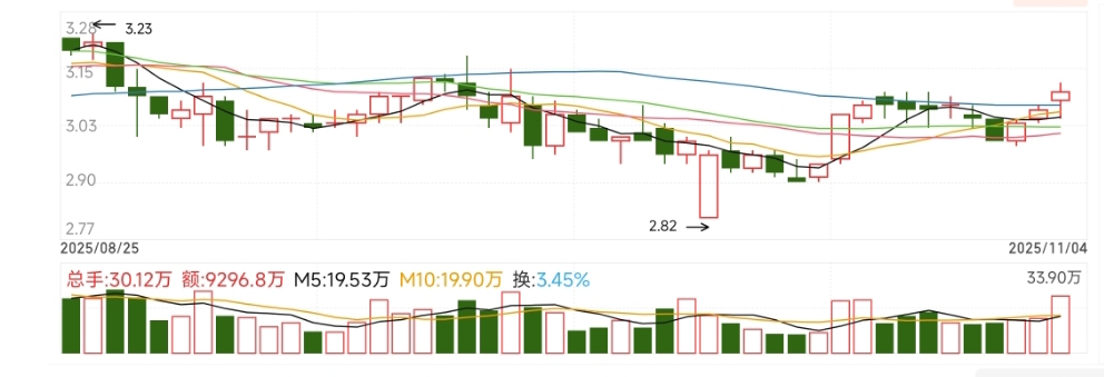 之前低点2.82,股价在2.82-3.05之间晃了几周,波动幅度不到8%——是典型的“窄幅横盘平台”,像“平地踱步攒劲儿”。