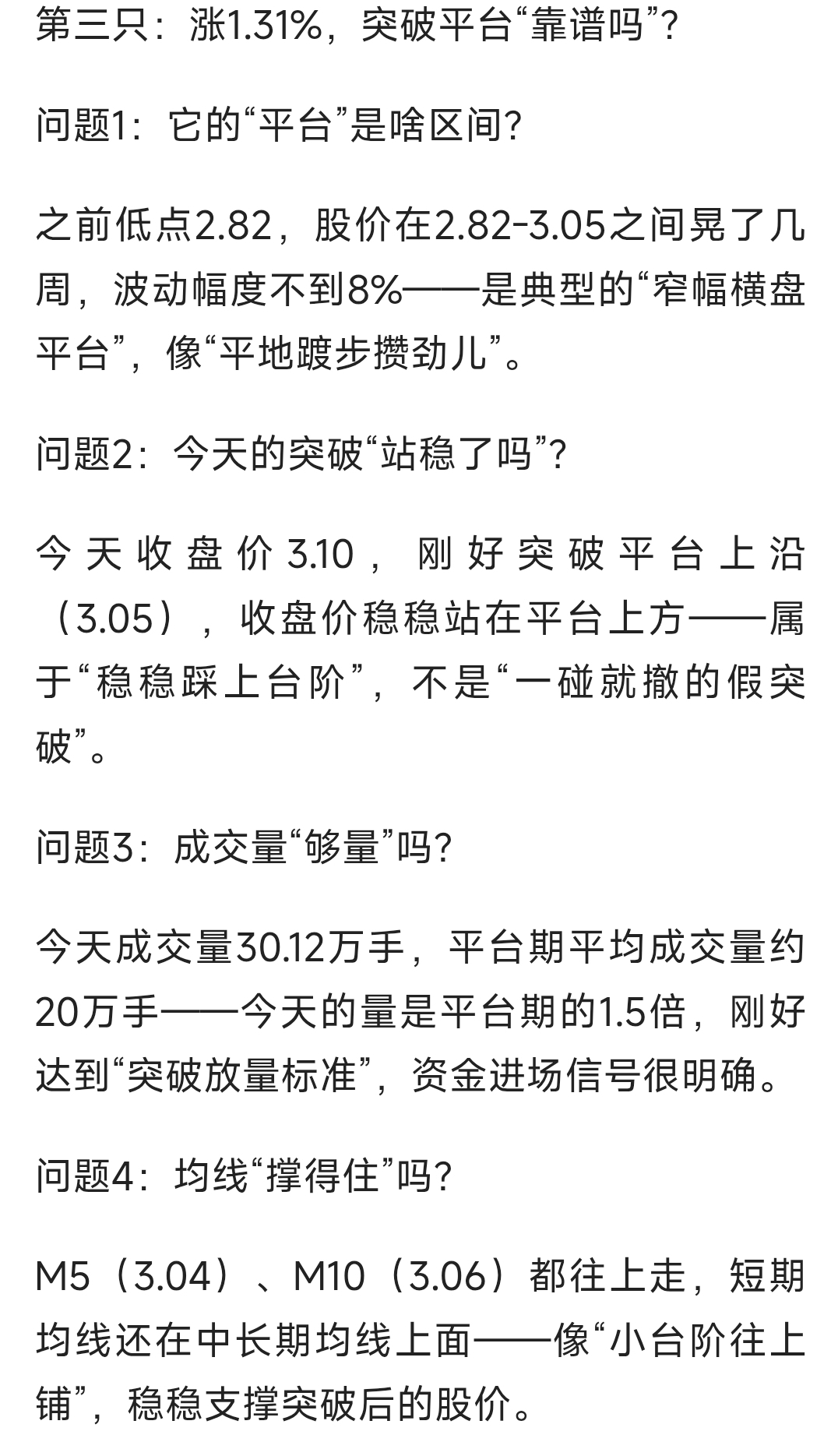 今天收盘价3.10,刚好突破平台上沿(3.05),收盘价稳稳站在平台上方——属于“稳稳踩上台阶”,不是“一碰就撤的假突破”。