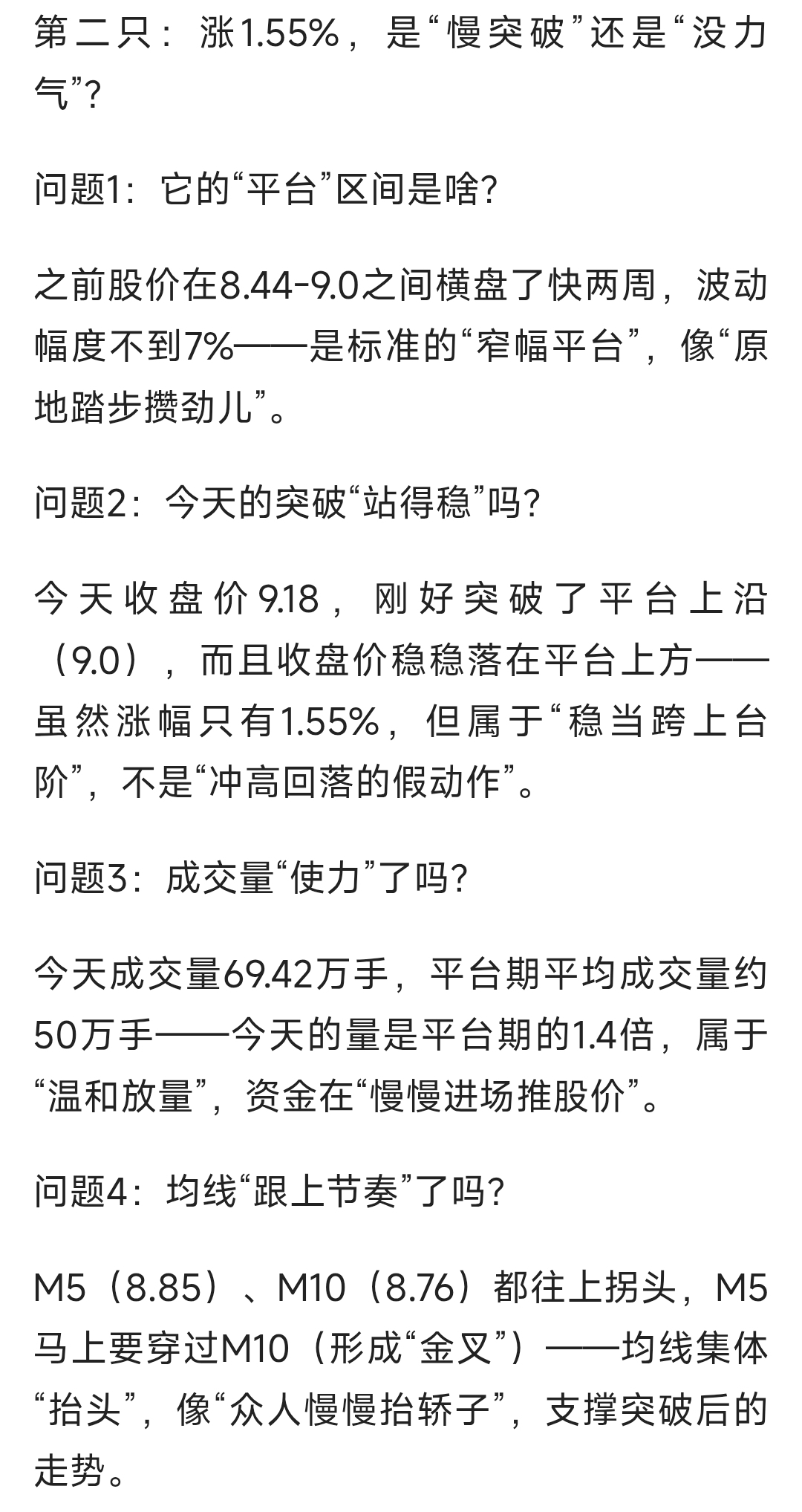 M5(8.85)、M10(8.76)都往上拐头,M5马上要穿过M10(形成“金叉”)——均线集体“抬头”,像“众人慢慢抬轿子”,支撑突破后的走势。