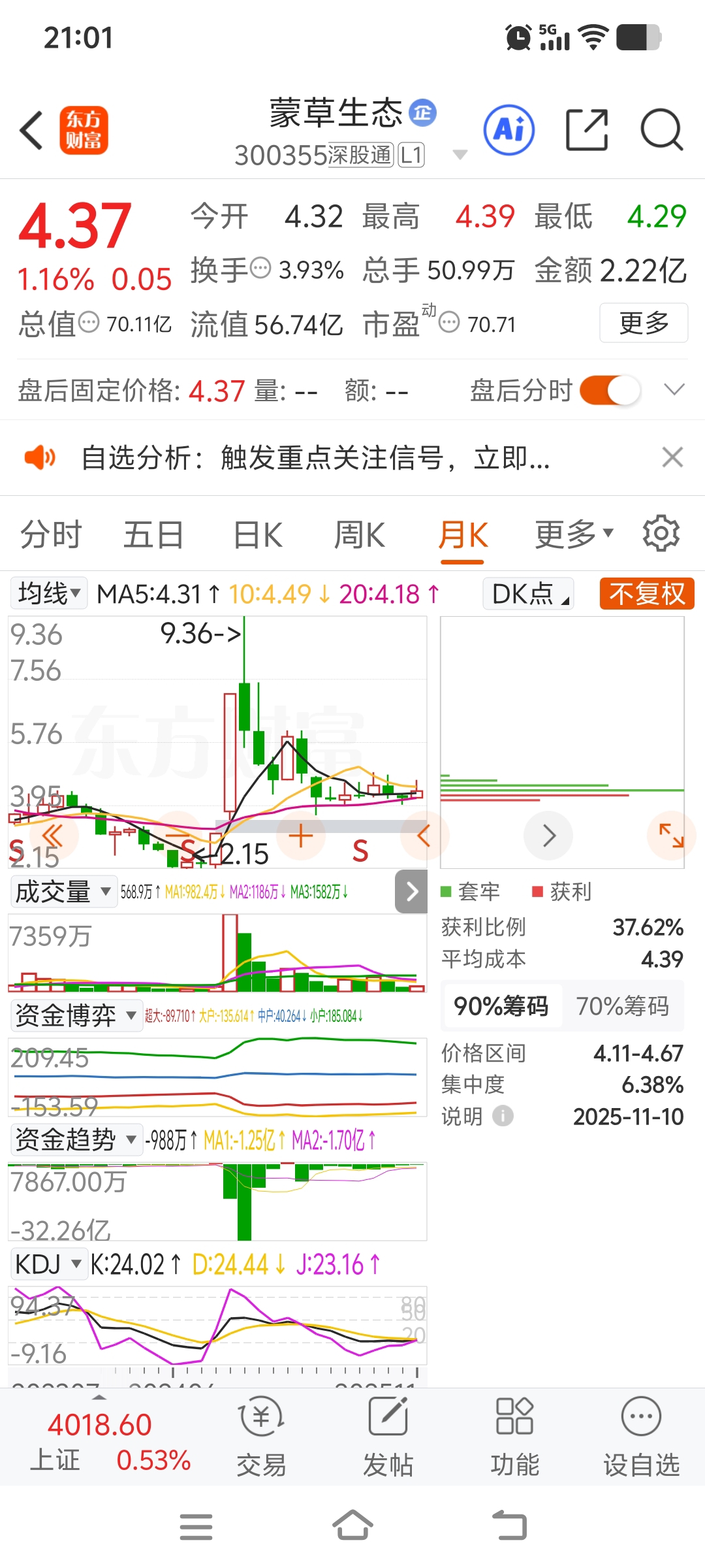 $蒙草生态(SZ300355)$ 前期大牛股,2元多到9元多,这股我还亏损30%多,一直未出,近期有打资金介入,具体看日k线,月线看,调整基本到位,量能缩量缩的非常不错,加上该股流通盘不大,也不亏损,作为创业板草原生态第一股,一直有主力操盘,个人看法坚决持有!