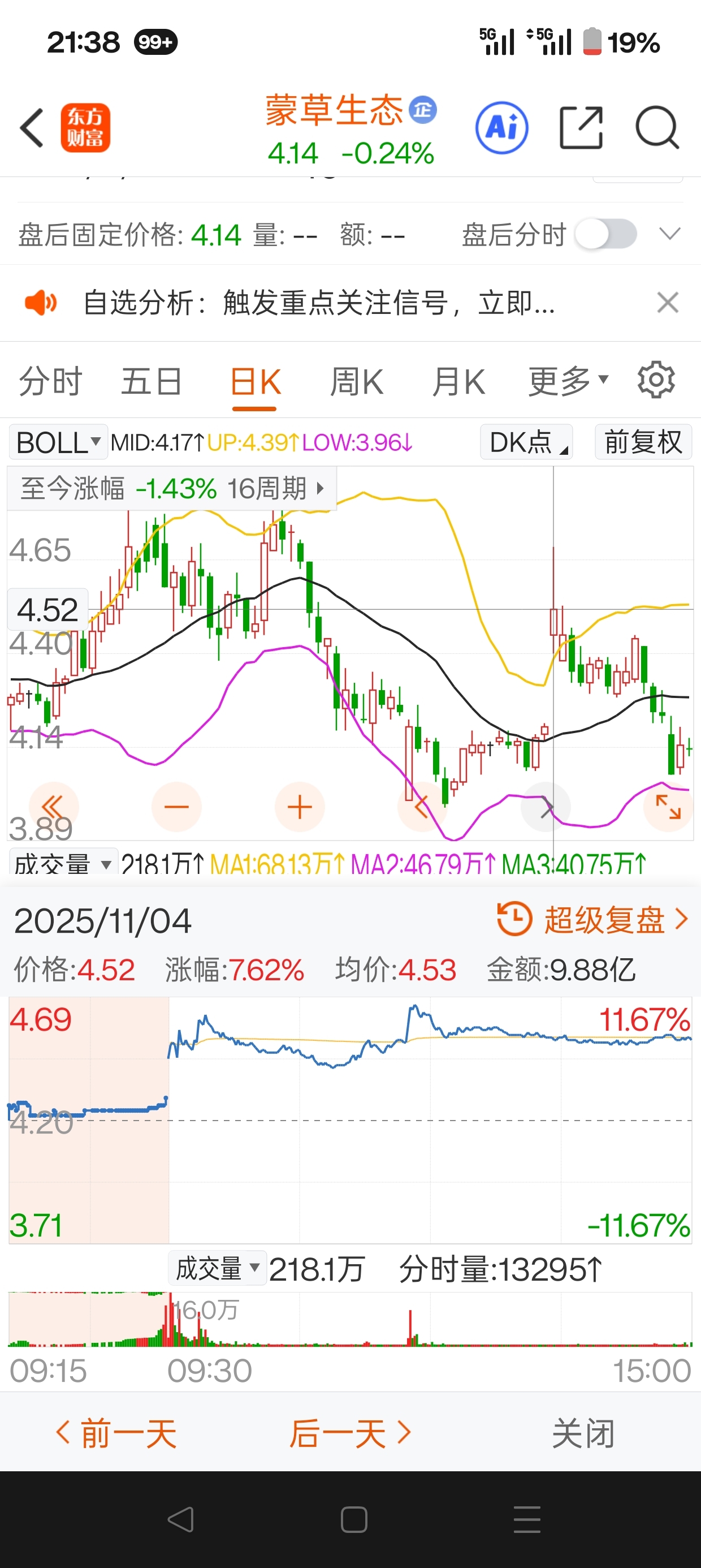 $蒙草生态(SZ300355)$ 蒙草?目前还是蛰伏状态,今天买了4.15立马给套住了。横盘整理,很多天了。之所以买,看到时间窗口就要到了,还有个我没有搞明白的是十一月四日,蒙草为啥跳空高开,盘中大涨十个点?还放出大量,我没有找到相关利好报道。正因为没有找到利好,突然大涨那才可以介入,如果谁能说明那天大涨的原因,蒙草还不适宜大规模介入。