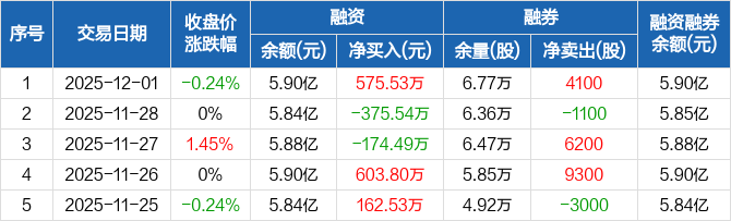 融资方面,当日融资买入1931.35万元,融资偿还1355.82万元,融资净买入575.53万元。融券方面,融券卖出4200股,融券偿还100股,融券余量6.77万股,融券余额28.37万元。融资融券余额合计5.9亿元。