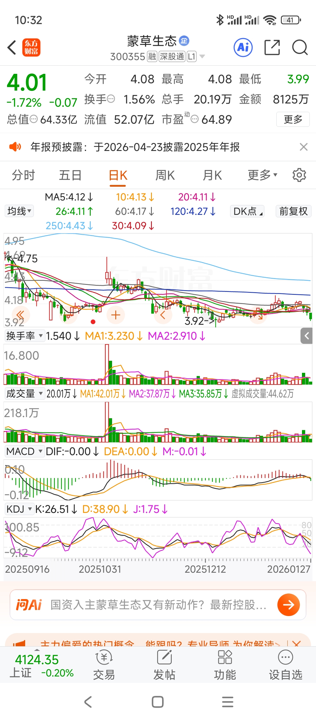 $蒙草生态(SZ300355)$ 马儿吃草,把草连根拔起吃,缩量下跌。