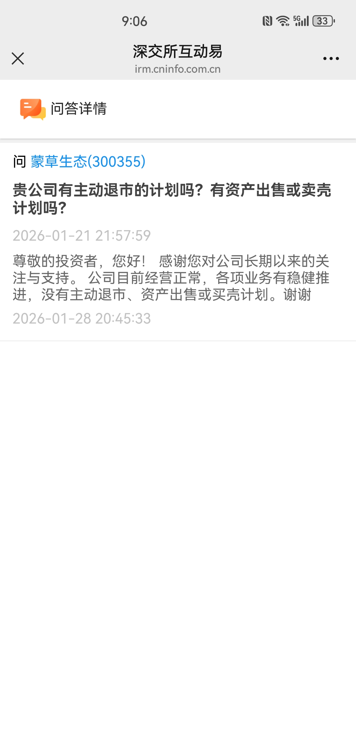 董秘回答:蒙草生态没有买壳,退市,卖资产的计划。有点语无伦次。看董秘回答:“买壳