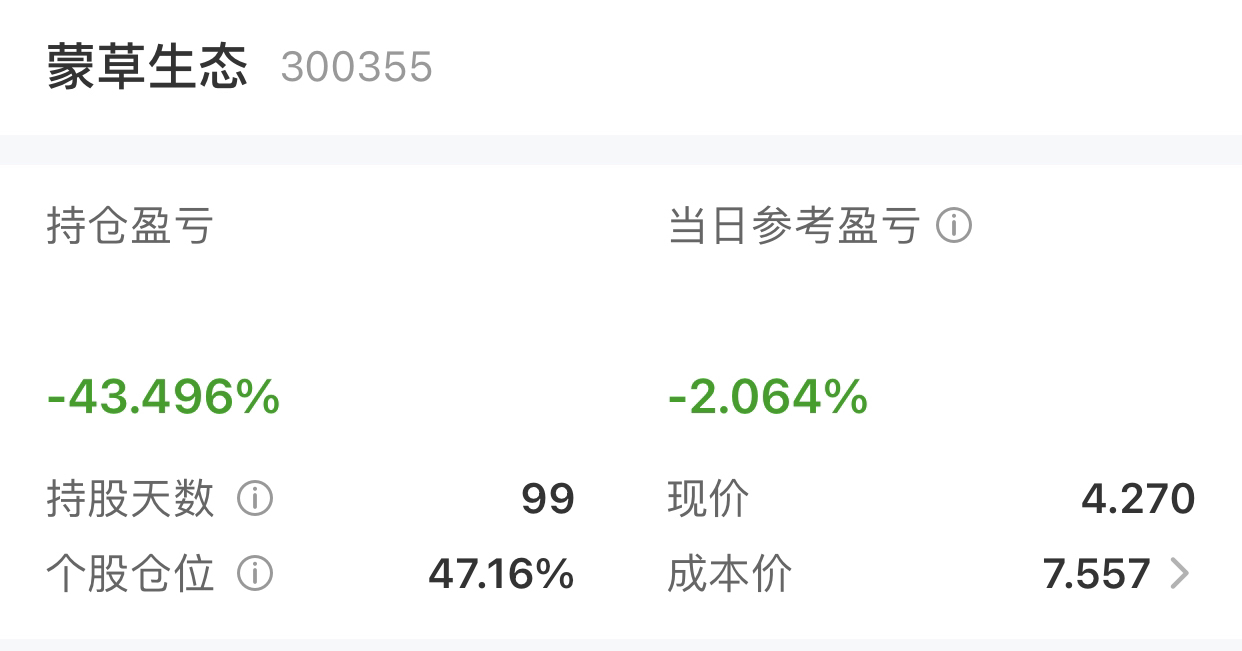 $蒙草生态(SZ300355)$ 持股近5个月,一路高买低卖把成本做到8元多,按今天的价格推算已亏损-43.414%,按现在的技术图形股价已在多条均线以下,后市估计还要下跌。