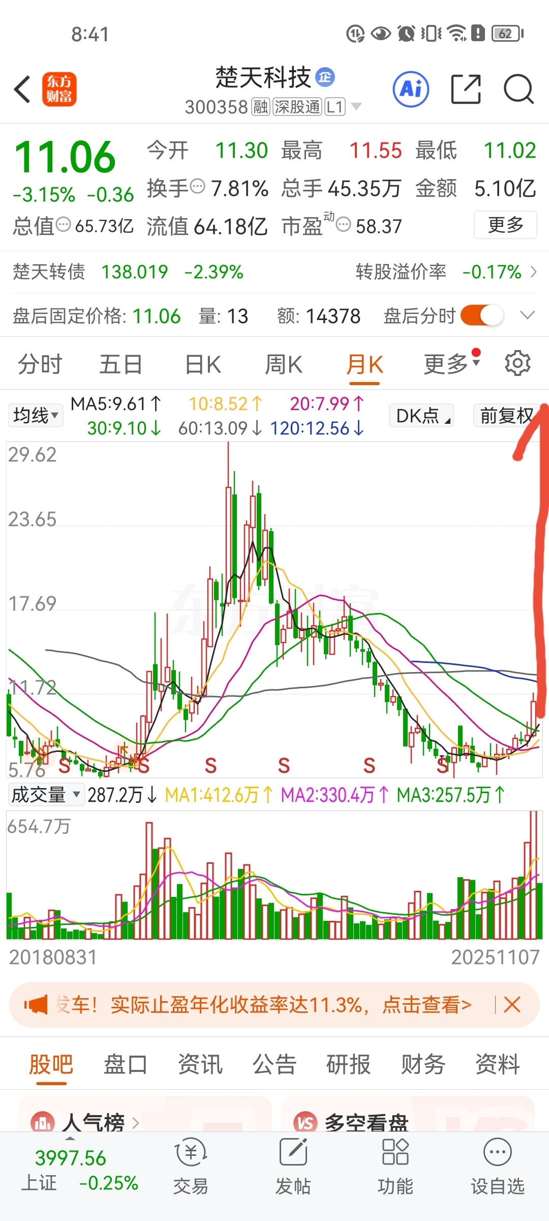 $楚天科技(SZ300358)$ 我预测月线突破天际