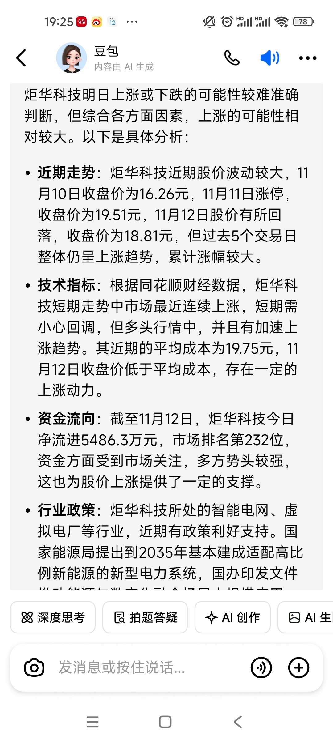 $炬华科技(SZ300360)$ 看看豆包的炒股水平如何?豆包说明天看涨!