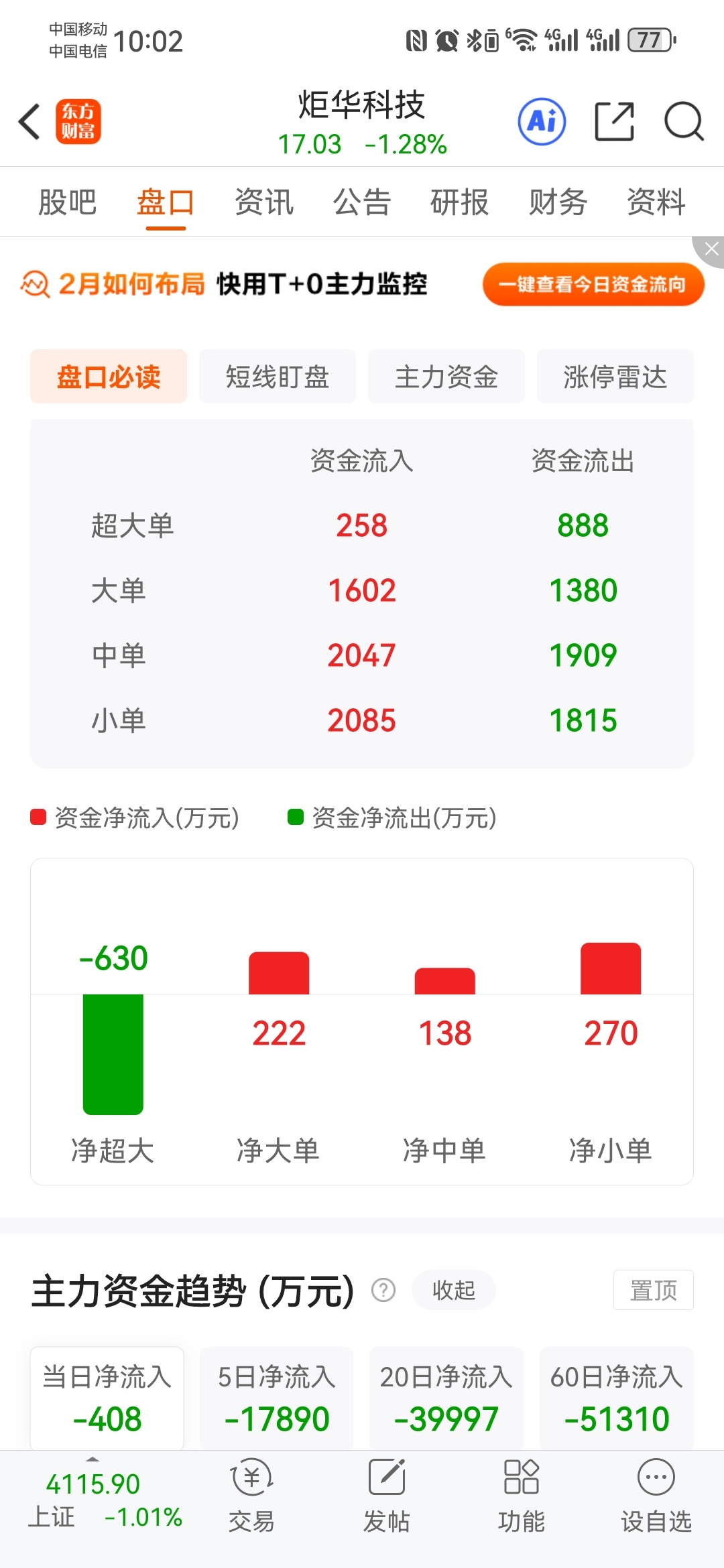 $炬华科技(SZ300360)$ 资金出逃很明显