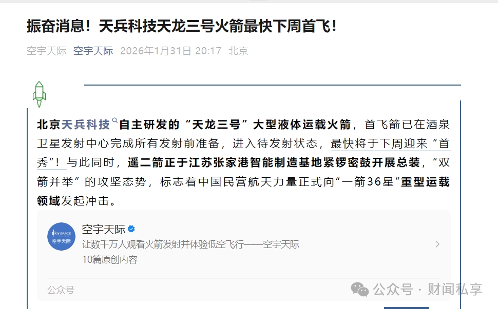 天兵科技天龙三号火箭最快本周首飞!(参股:海翔药业、炬华科技、天汽模)$海翔药业(SZ002099)$ $炬华科技(SZ300360)$ $天汽模(SZ002510)$