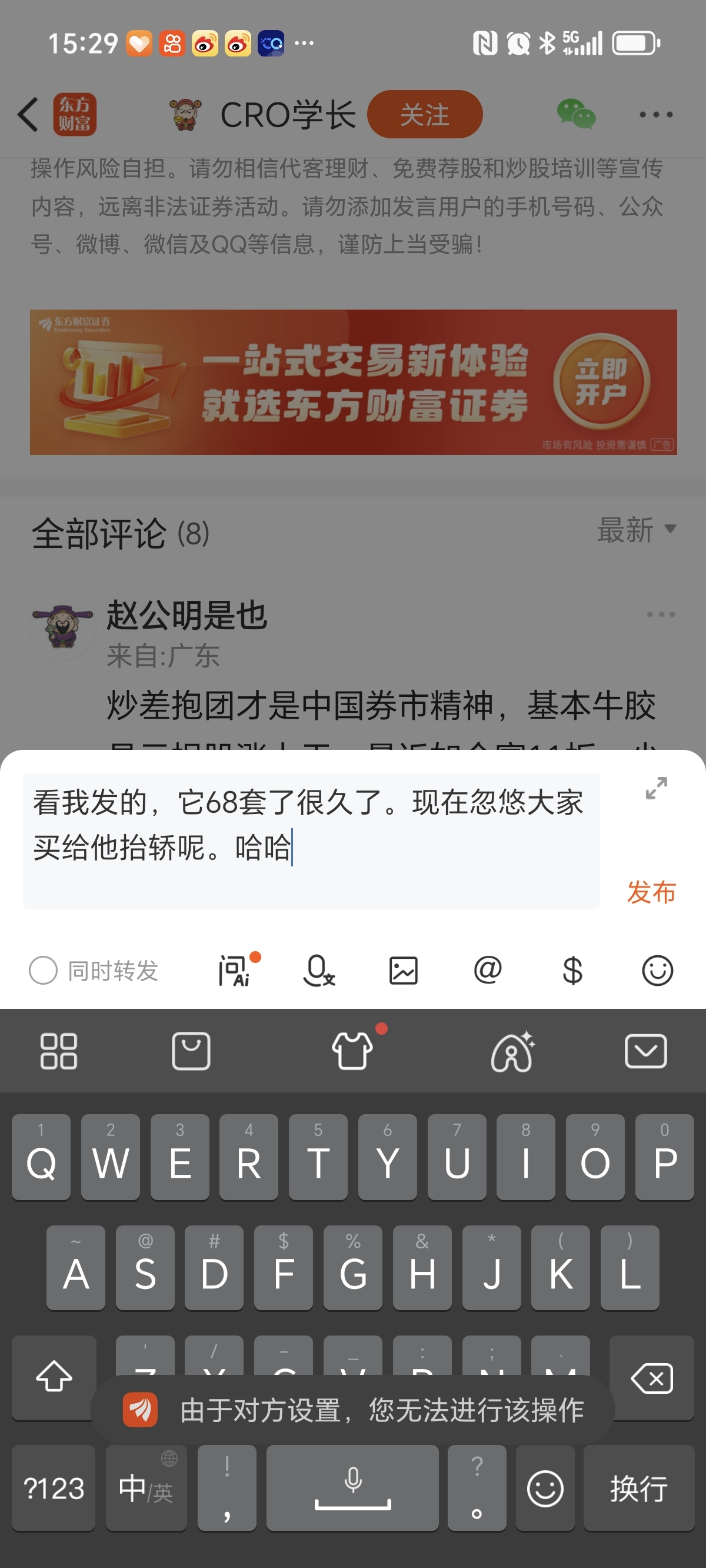 温馨提示: 1.根据《证券法》规定,禁止编造、传播虚假信息或者误导性信息,扰乱证券市场;2.用户在本社区发表的所有资料、言论等仅代表个人观点,与本网站立场无关,不对您构成任何投资建议。用户应基于自己的独立判断,自行决定证券投资并承担相应风险。《东方财富社区管理规定》