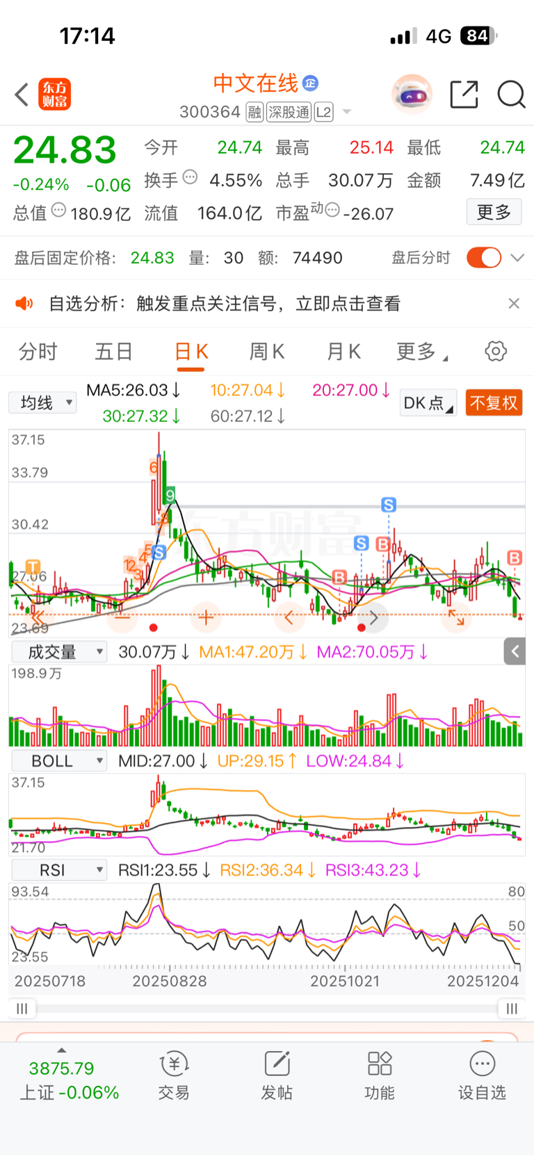 $中文在线(SZ300364)$ 底部缩量空头杀不动了,布林线触底,rsi也接近20短期必反弹,我又进来了
