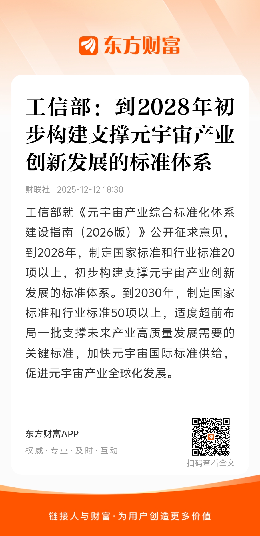 工信部就《元宇宙产业综合标准化体系建设指南(2026版)》公开征求意见,到2028年,制定国家标准和行业标准20项以上,初步构建支撑元宇宙产业创新发展的标准体系。到2030年,制定国家标准和行业标准50项以上,适度超前布局一批支撑未来产业高质量发展需要的关键标准,加快元宇宙国际标准供给,促进元宇宙产业全球化发展。