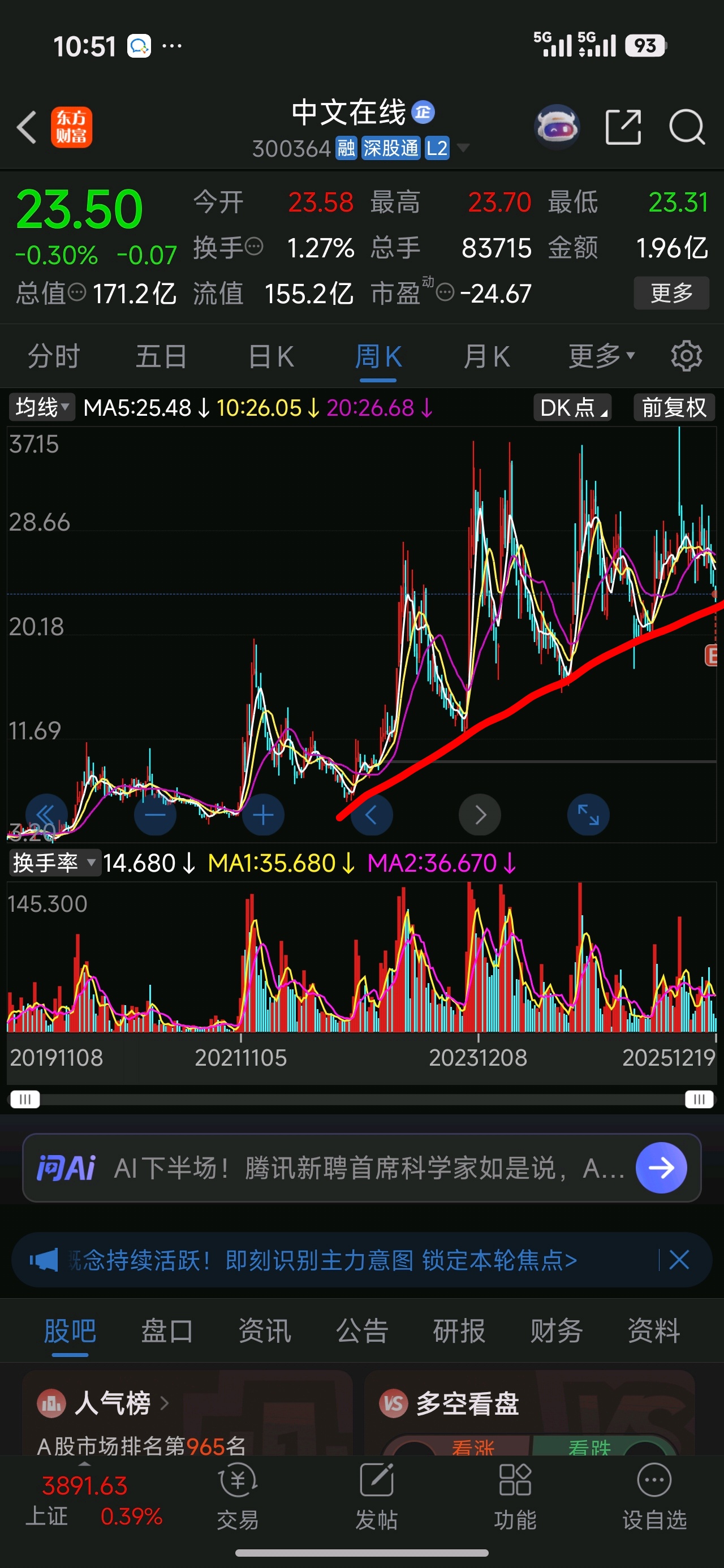 $中文在线(SZ300364)$ 周线支撑点已回踩,等待放量了