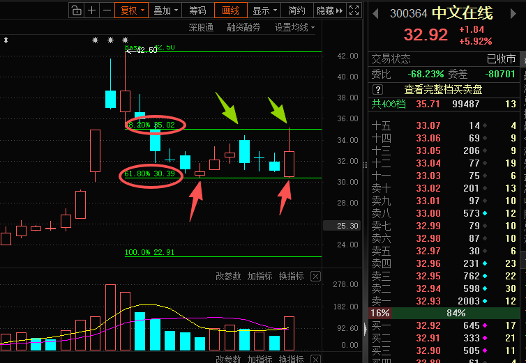 最近大盘横盘震荡走势,个股像是打地鼠一样,完全不好把握。但是会了我的画线就比较醒目了!下面两天对比:第一个比较乱,完全不只是什么时候入,什么时候出!下图是我用了分析做T的方法:区间震荡时35.02左右是阻力可以出,下方30.39左右时支撑可以入场。大家对照看看我的方法简单吧!后面几天只要不放量改变横盘就会继续区间震荡,适合高抛低吸,低吸高抛!!