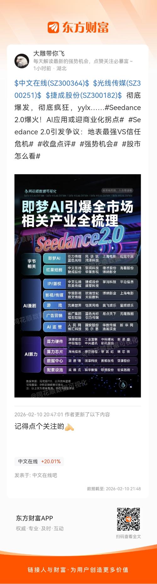 $中文在线(SZ300364)$ $光线传媒(SZ300251)$ $捷成股份(SZ300182)$ 彻底爆发,彻底疯狂,yylx……#Seedance 2.0爆火!AI应用或迎商业化拐点# #Seedance 2.0引发争议:地表最强VS信任危机# #收盘点评# #强势机会# #股市怎么看#
