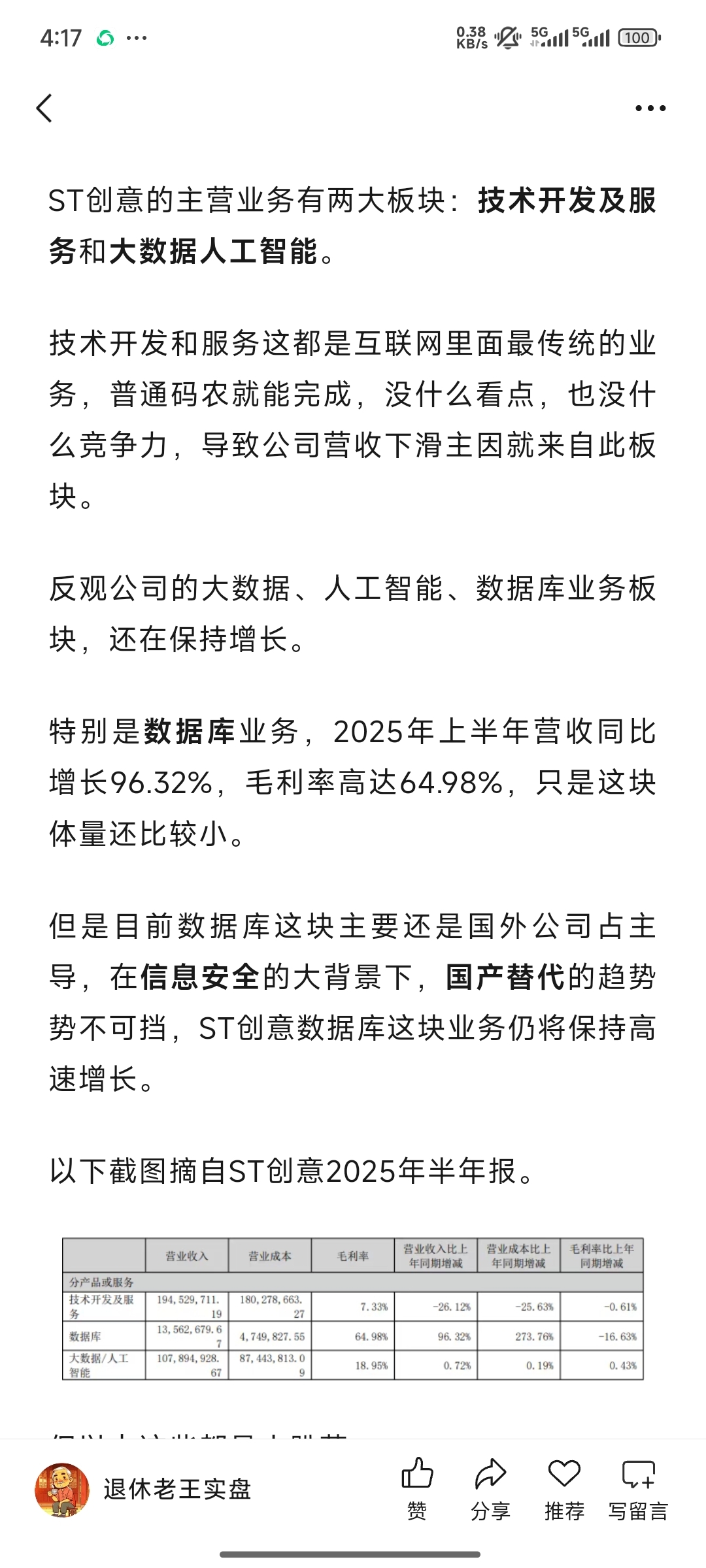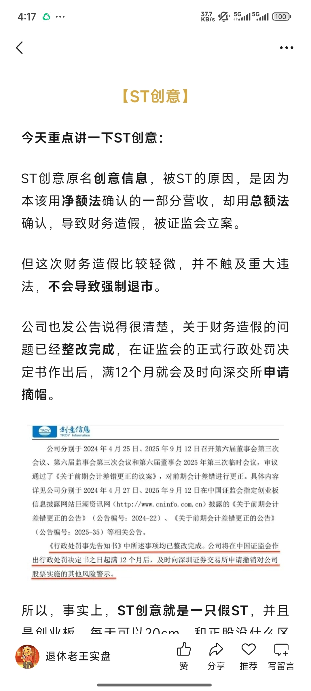 $ST创意(SZ300366)$ $康龙化成(SZ300759)$ $*ST大晟(SH600892)$ 加仓了ST创意,低位科技,没有退市风险,低轨道卫星概念。康龙化成走势很健康,继续看好创新药,看好CRO。ST大晟涨停很强,底仓继续持有。