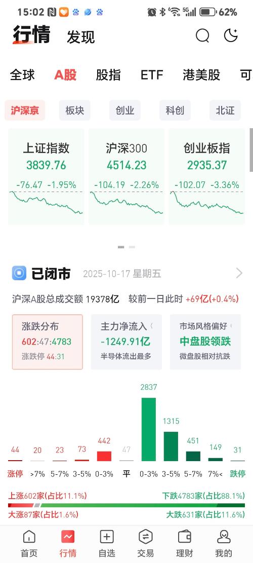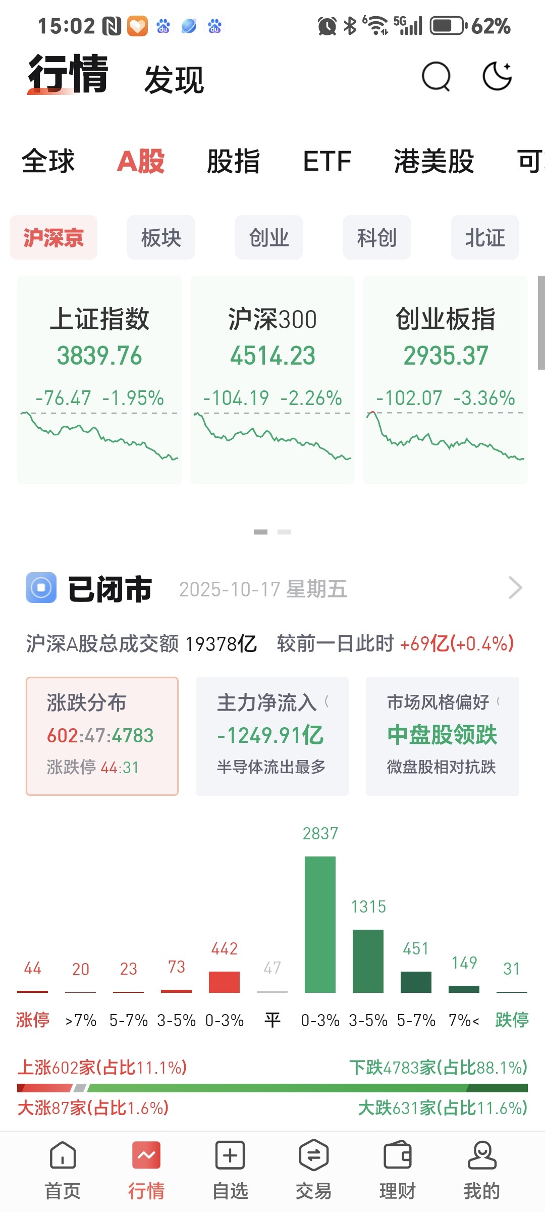 10月17日,大盘彻底beng了,沪市大盘跌破3850关口,跌1.95%,深证成指跌3.04%,创业板指跌3.77%。沪深两市只有602家上涨,4783家下跌,惨不忍睹。每当潮水退去,才知道散户在游泳创意9月份爆大雷,股民亏大钱。进入10月份,反而企稳反弹,跑赢了大盘。股市就是这样,涨涨跌跌,跌跌涨涨,在里面玩的就是一个心跳。心脏不好的,千万不要玩股票,保命要紧。