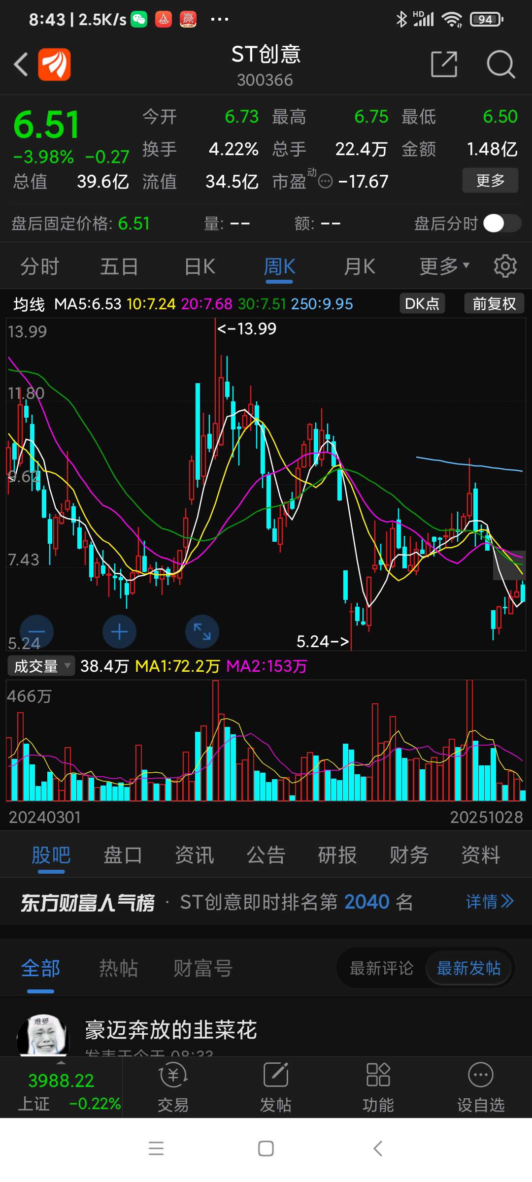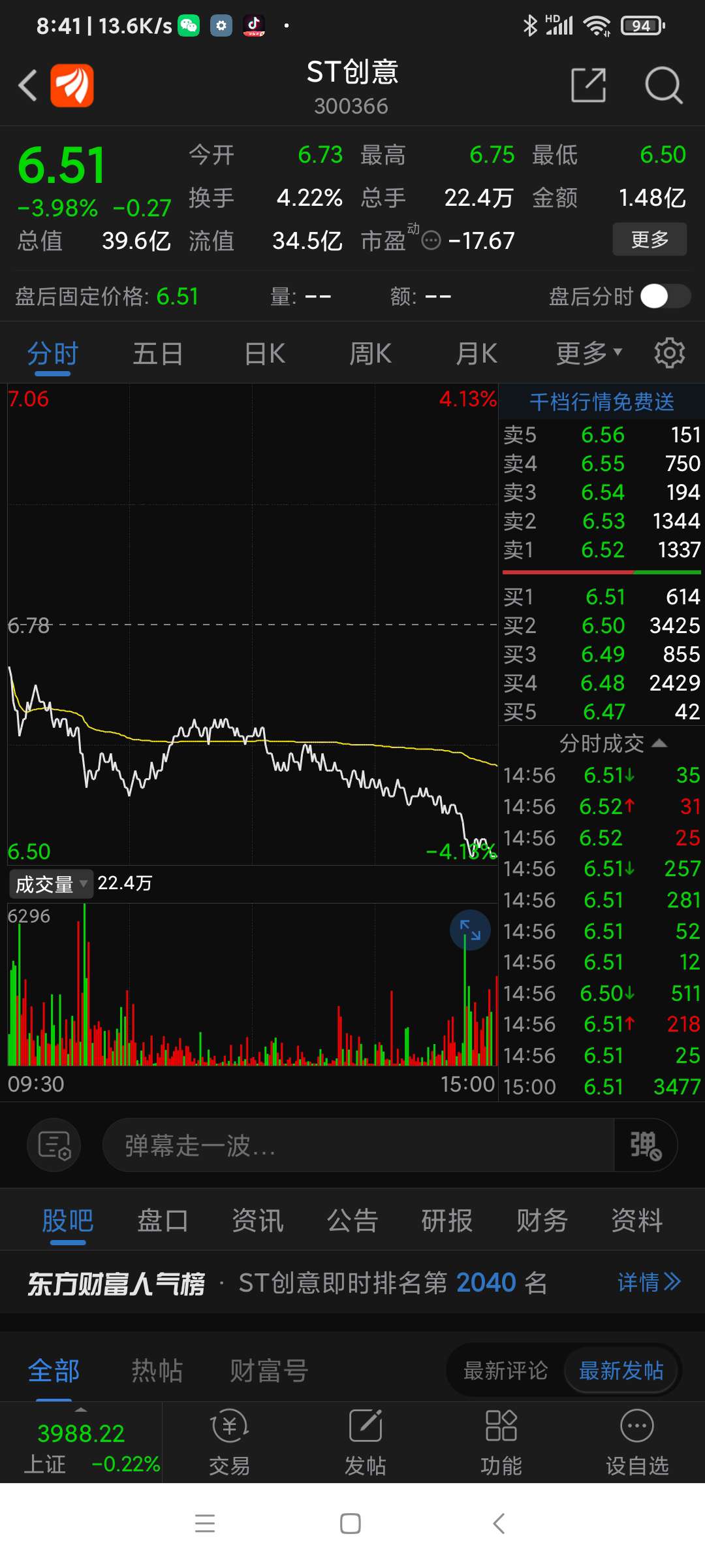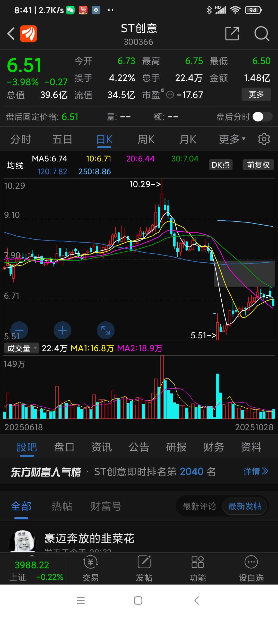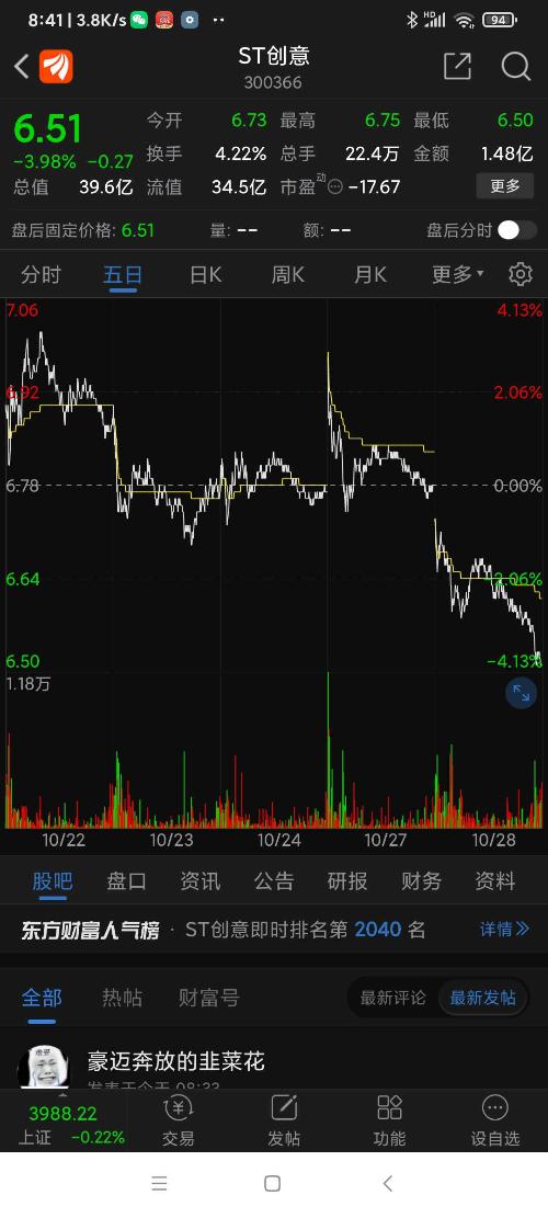 ST创意昨日表现,跌下来是机会,股吧热度不减,谁都盯着……