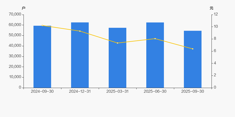 截至2025年9月30日,公司最新总股本为6.08亿股,其中流通股本为5.31亿股。户均持有流通股数量由上期的8487股上升至9726股,户均流通市值6.2万元。