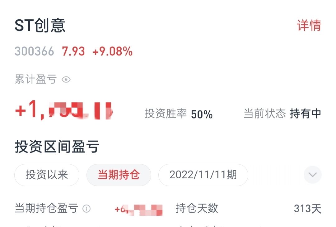 $ST创意(SZ300366)$ 持仓313天,终于解套了,今天减半,坚持就是胜利,看好他