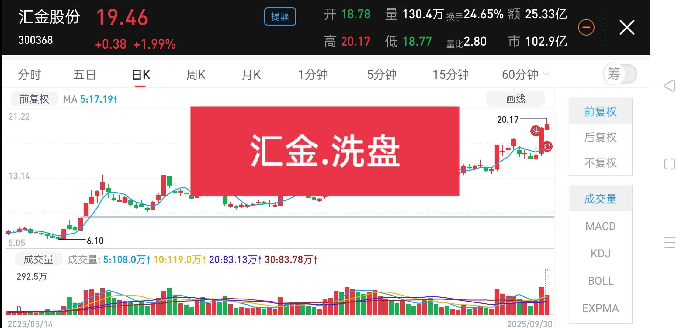 汇金股份:洗盘、调整