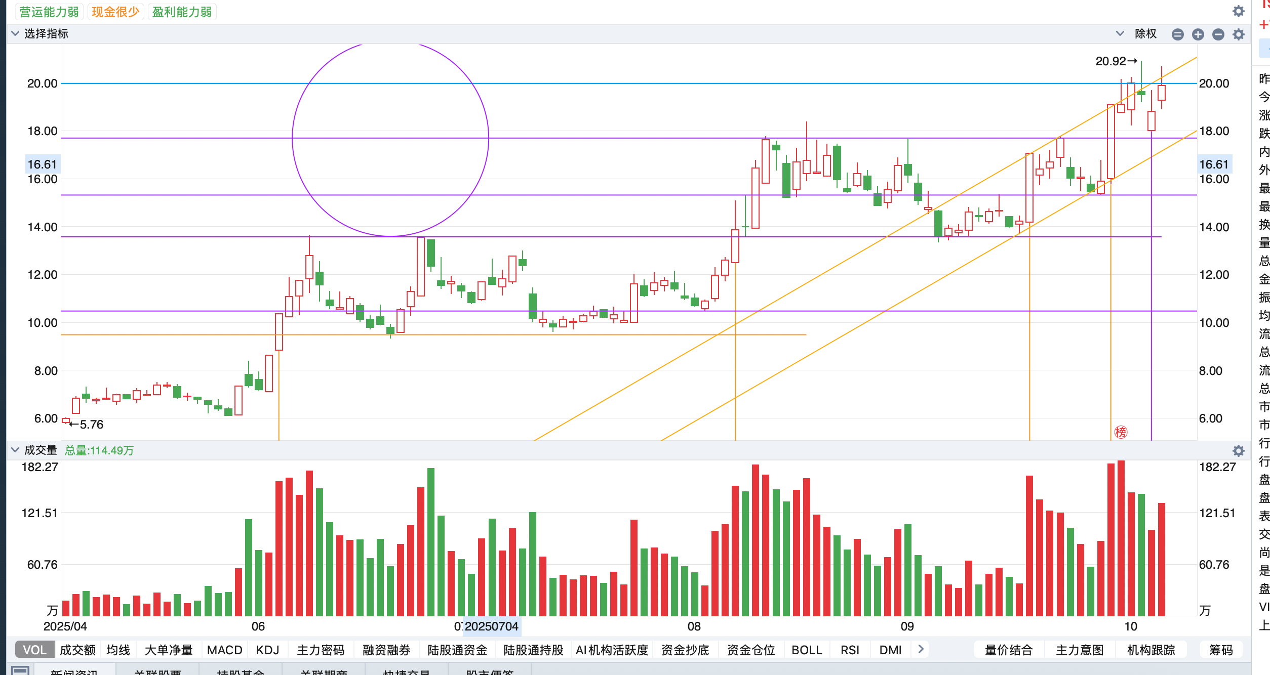 好久没有发贴了,也不知道明天能不能突破21.80不,明天不是很好的买点,如果明天如果低开的话可以买点,不破18就可以拿着,不能突破21.80,估计就要回调,突破21.80,估计有那么一点点可能涨停