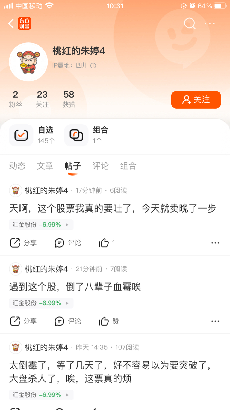 $汇金股份(SZ300368)$ @桃红的朱婷4,你只配吃我的矢!看看,老子20上提醒几次高抛。你这种没脑子的够那里看得懂!昨天19.3入的,冲20.8,大盘跳,板块跳没机会卖?
