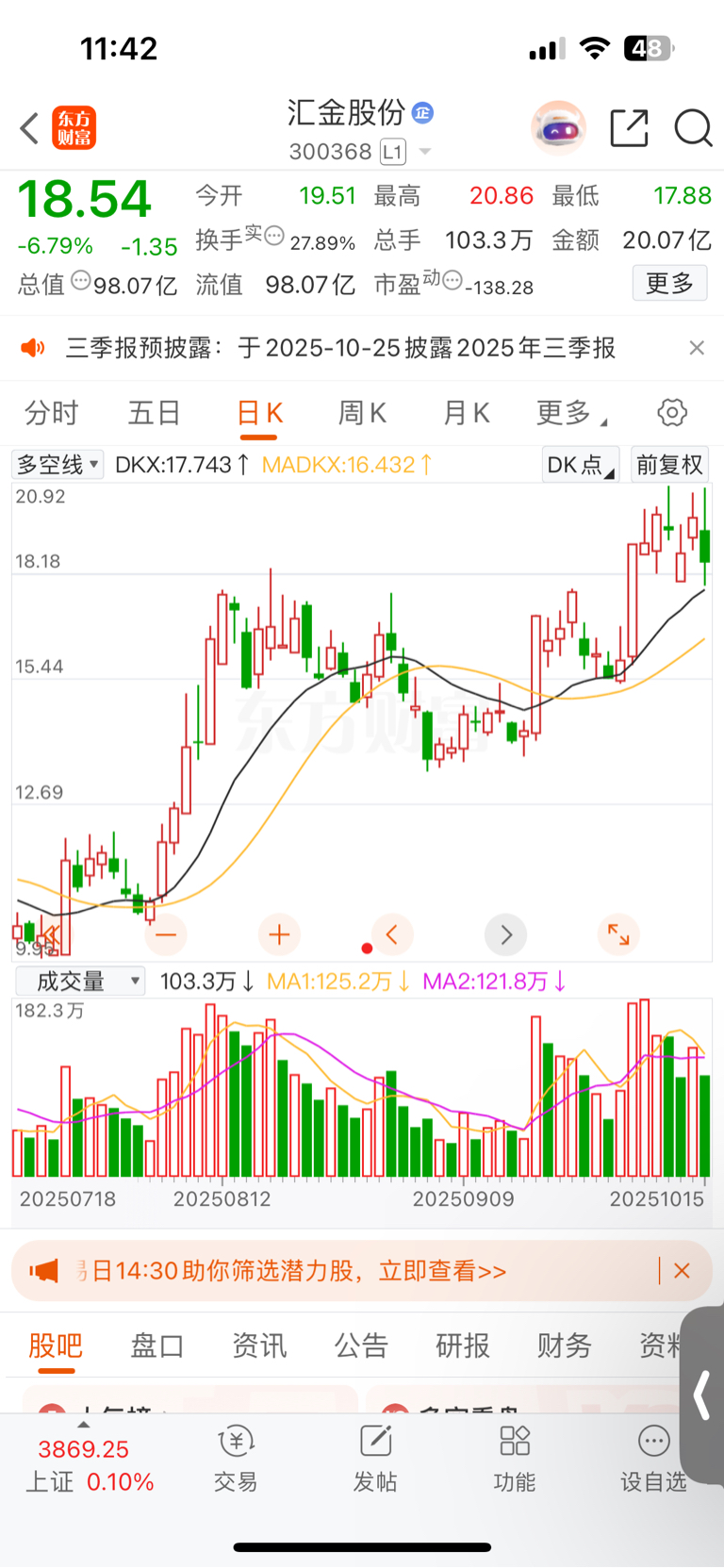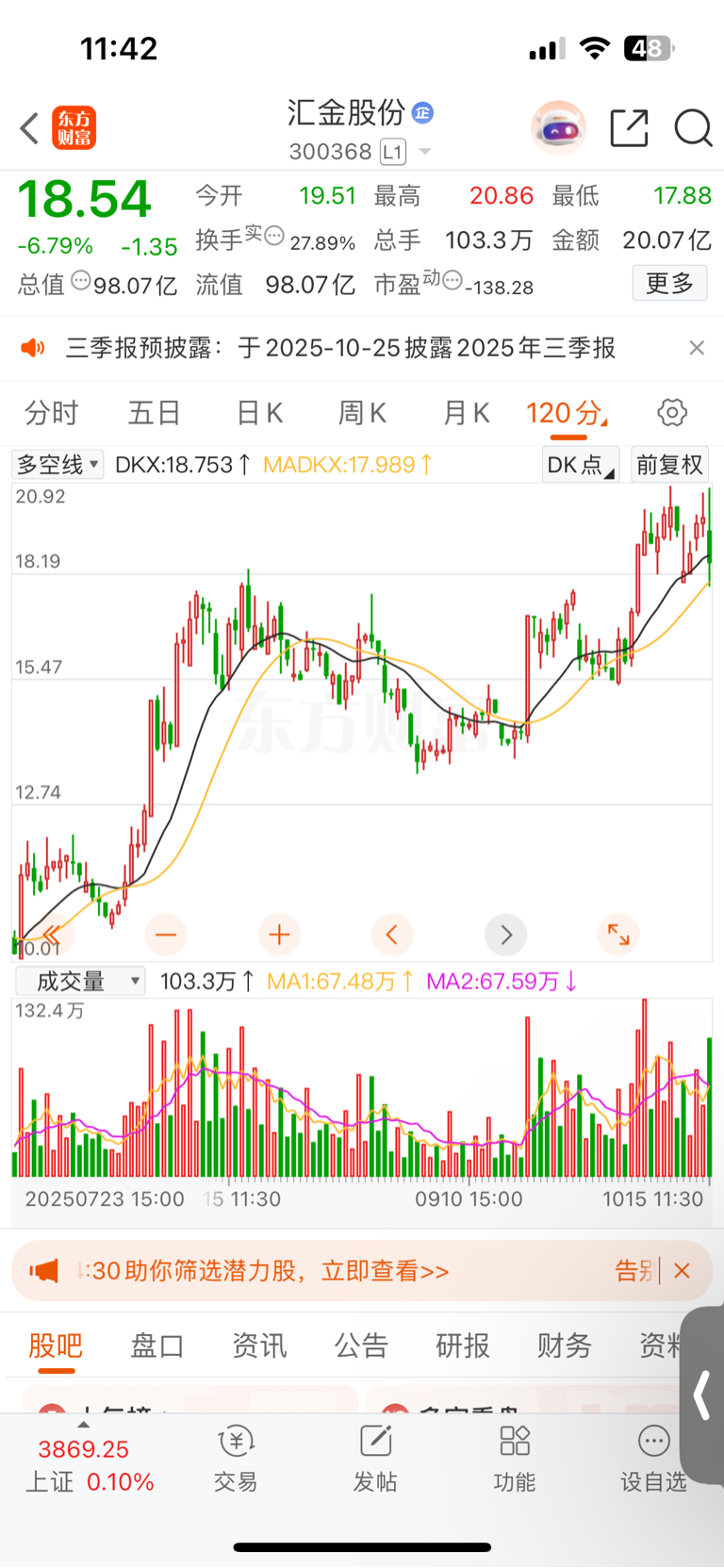 $汇金股份(SZ300368)$ 今天的调整无论是从日线级别,还是120分钟级别,都是在合理范围内可以接受的,趋势并没有发生改变。至于今天是谁砸盘,是获利盘还是量化,还是主力洗盘,都无需去猜,猜没有意义。不破位,有活跃的成交量,就继续看,破位了再看空,日内波动是用来做t的时机,而不是用来干扰你情绪和判断的