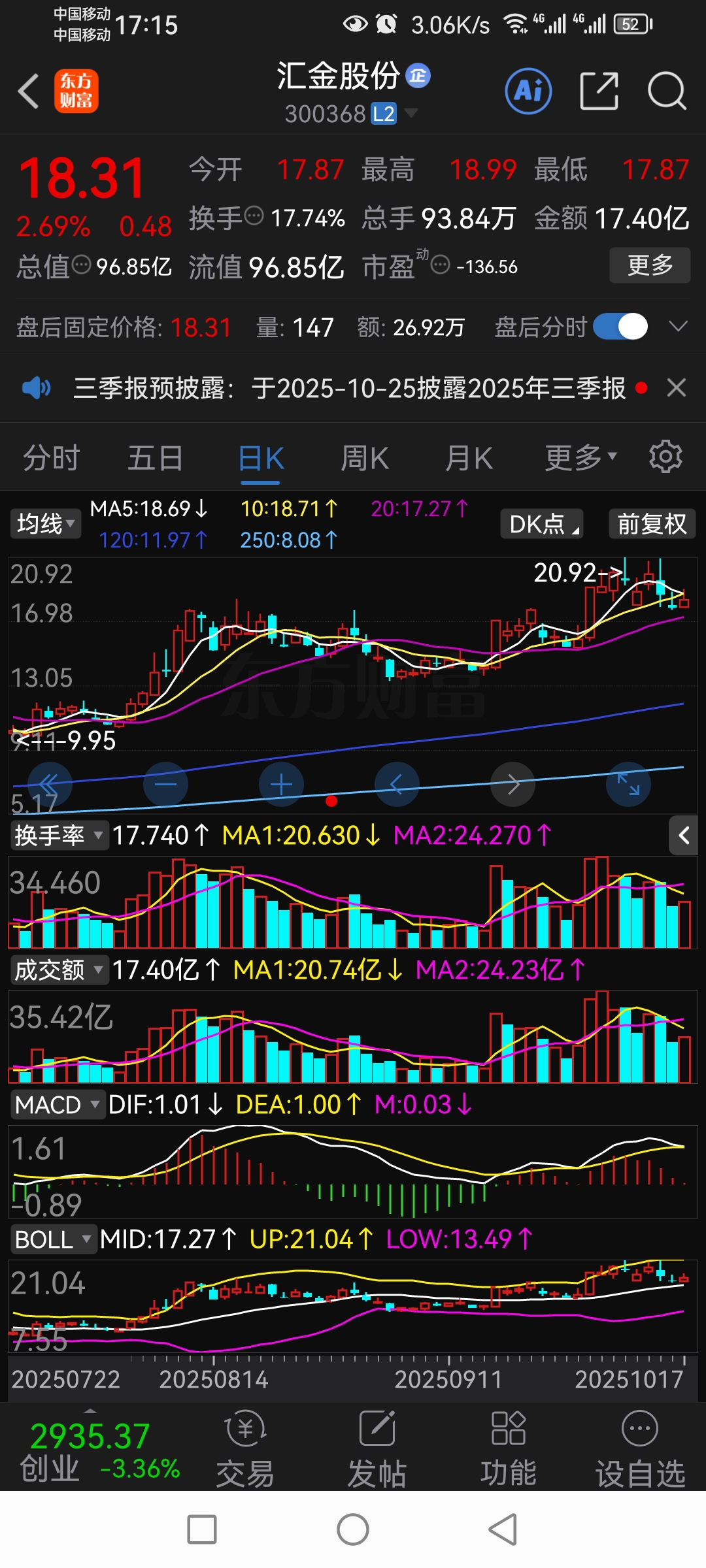 $汇金股份(SZ300368)$ 今天早盘的拉升是博下星期反弹的超短线资金进场所为,下星期再调整1到2天跌破20日线(17.10元)可大胆抄底进场抢短线反弹利润(20%左右)