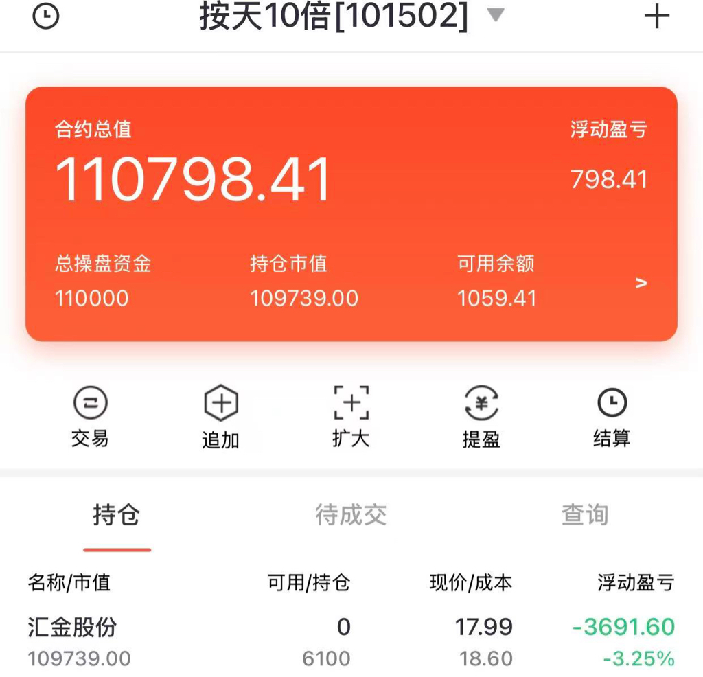 今天感觉汇金有机会,直接选择十倍介入,结果掉下来了,明天估计危险了