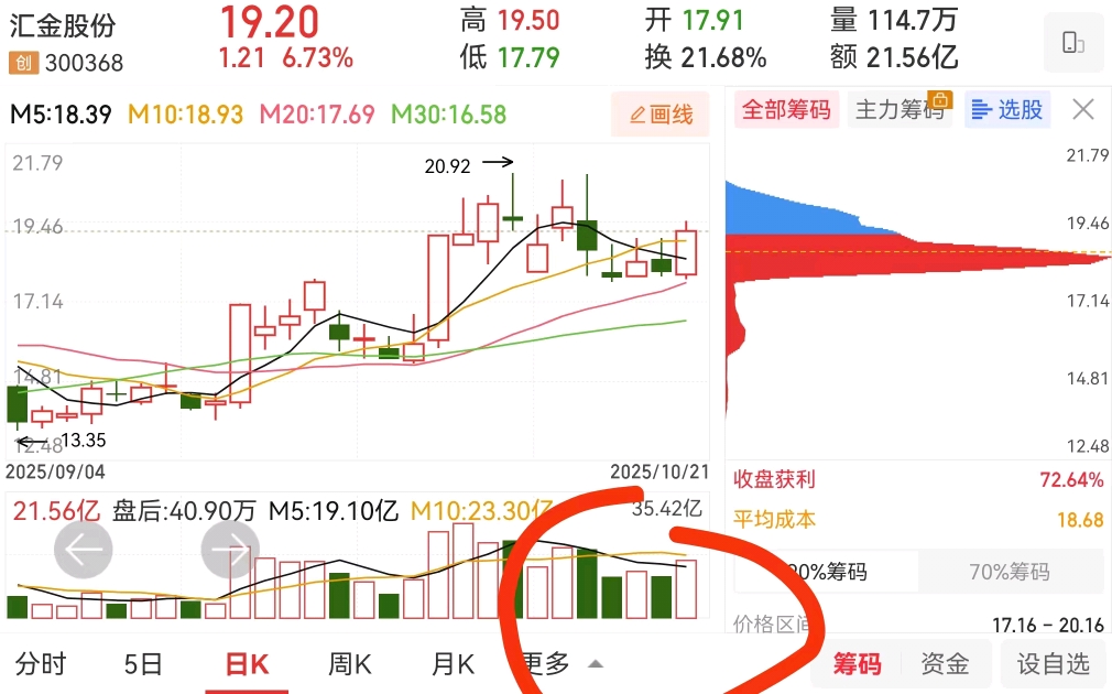 $汇金股份(SZ300368)$ 量能红肥绿瘦,底部支撑明显,继续看涨