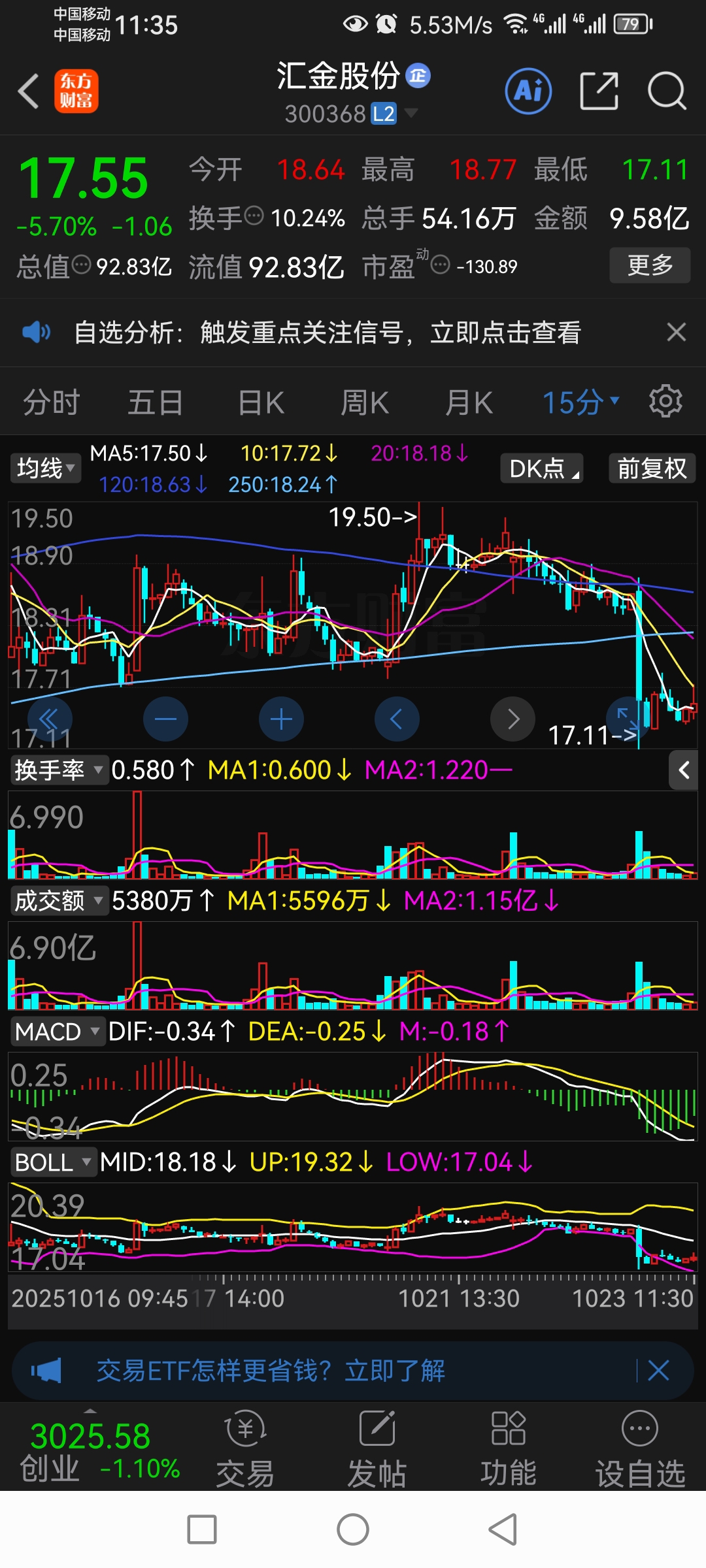 $汇金股份(SZ300368)$ 从15分钟K线图看今天收盘价应该收在17.30元到17.35元之间。前段时间18元到17.80元的支撑位会变成明天反弹的强压力位。今天17.33抄底了明天赚它3个点清仓大甩卖