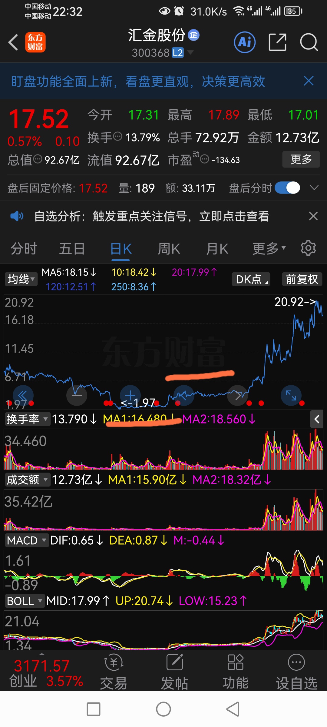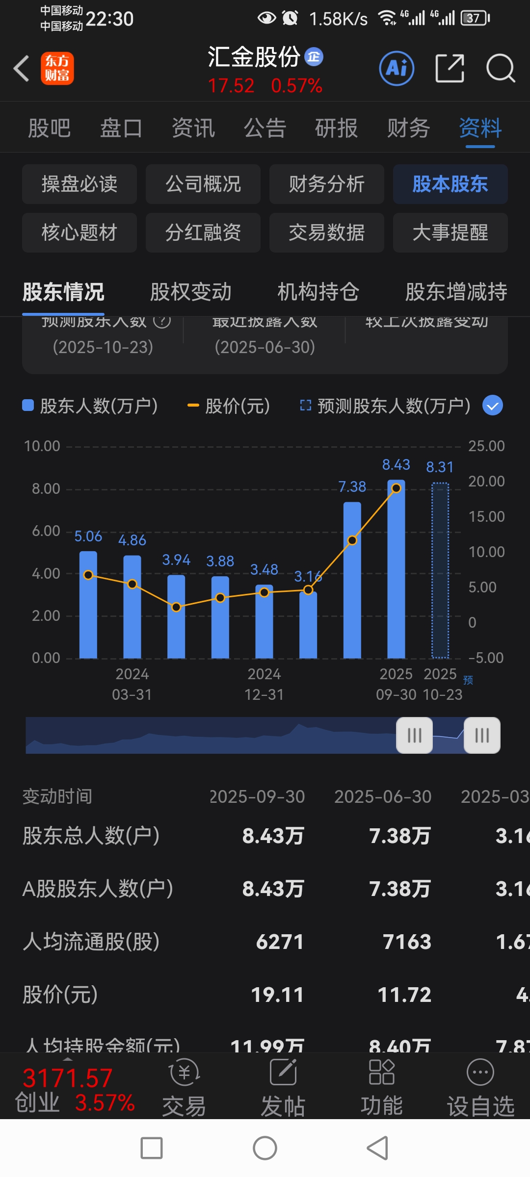 $汇金股份(SZ300368)$ 有货的兄弟们星期一有多快跑多快,这波要跌到14元左右才能有支撑了。汇金我8月6日开始上车反反复复T了10多次非常了解它,星期一90%机会是低开4个点了。主力一年前在2元到4元两个平台吸足了筹码,现在正是兑现阶段(流通股股东在高位猛增差不多2.7倍)