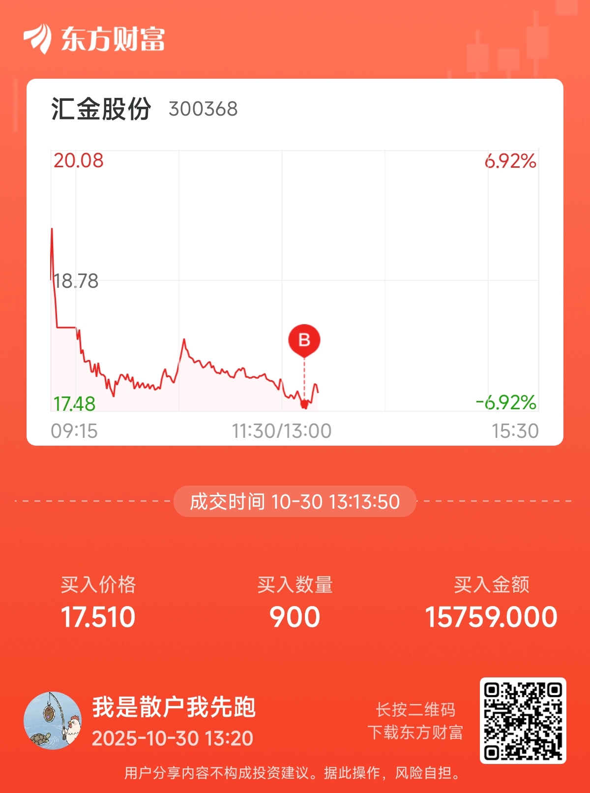 $汇金股份(SZ300368)$ 我17.51上车了,这个是底部了吗