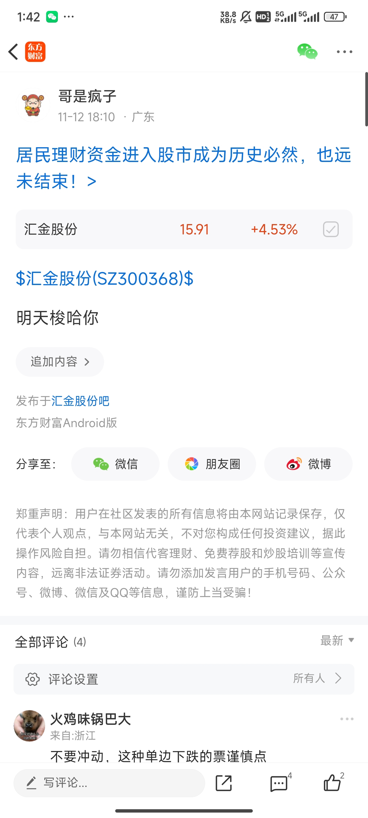 温馨提示: 1.根据《证券法》规定,禁止编造、传播虚假信息或者误导性信息,扰乱证券市场;2.用户在本社区发表的所有资料、言论等仅代表个人观点,与本网站立场无关,不对您构成任何投资建议。用户应基于自己的独立判断,自行决定证券投资并承担相应风险。《东方财富社区管理规定》