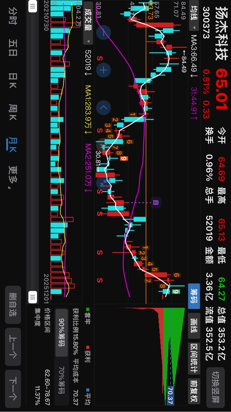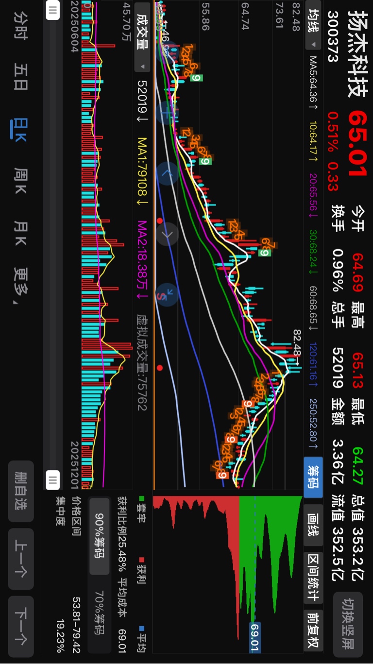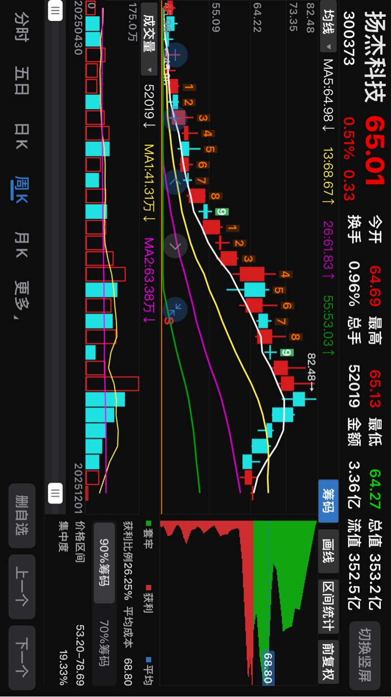 $扬杰科技(SZ300373)$ 现在短期盘面面临5日线压力与26日线支撑的搏弈,如果量能总是放不出来,5日线压力下破26日线机率大增!目前温水煮青蛙,多看少动,弱势尽显的情况下向下寻求月线向上突破时的颈线位置,向下空间还很大!小心行得万年船,耐心等待再次入场的机会!