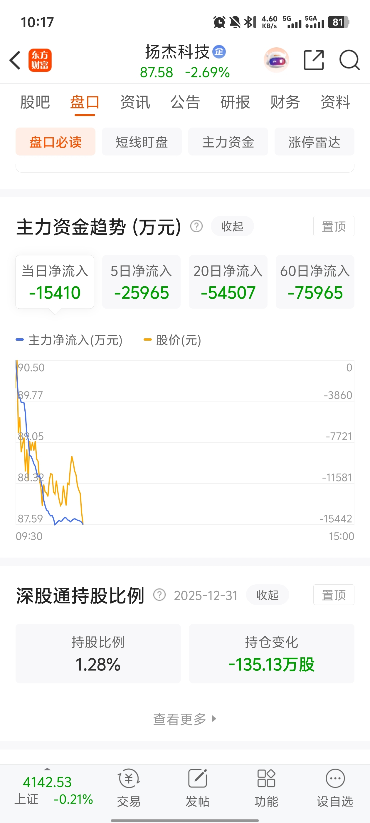 $扬杰科技(SZ300373)$ 主力保持高强度流出
