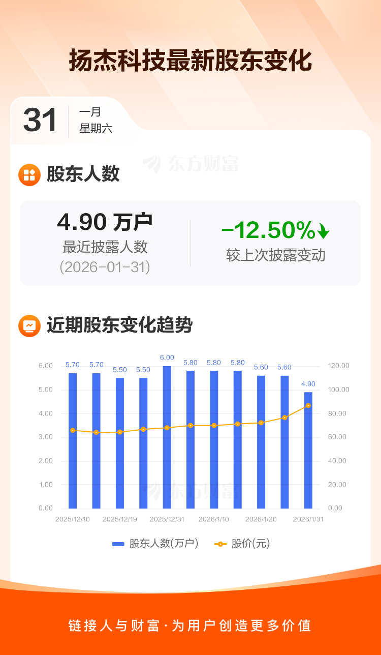 扬杰科技最新披露数据显示,截至1月31日公司股东户数为4.90万户,较上期(2026年1月22日)减少7000户,降幅为12.50%。户均持有流通股数量由上期的9681股上升至1.11万股,户均持股金额由上期的74.15万元增加至96.04万元。