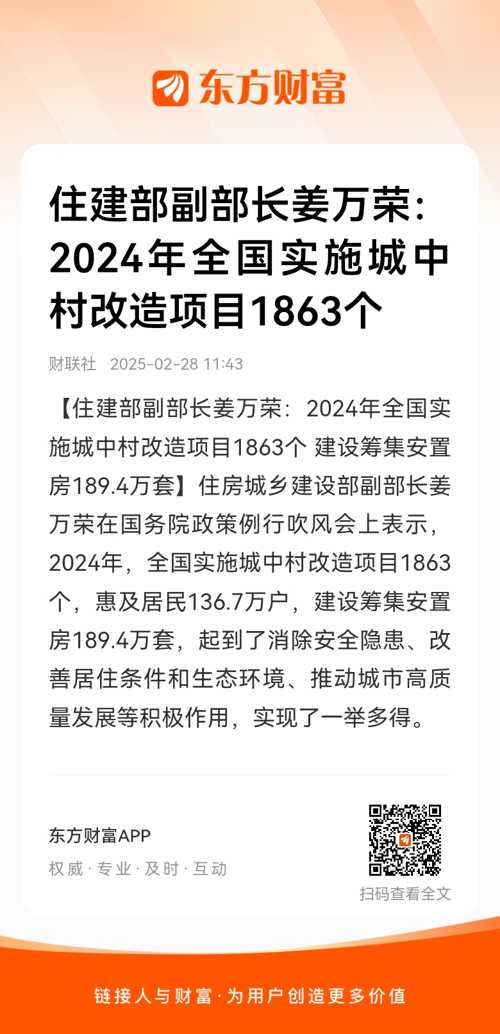 住房城乡建设部副部长姜万荣在国务院政策例行吹风会上表示,2024年,全国实施城中村改造项目1863个,惠及居民136.7万户,建设筹集安置房189.4万套,起到了消除安全隐患、改善居住条件和生态环境、推动城市高质量发展等积极作用,实现了一举多得。
