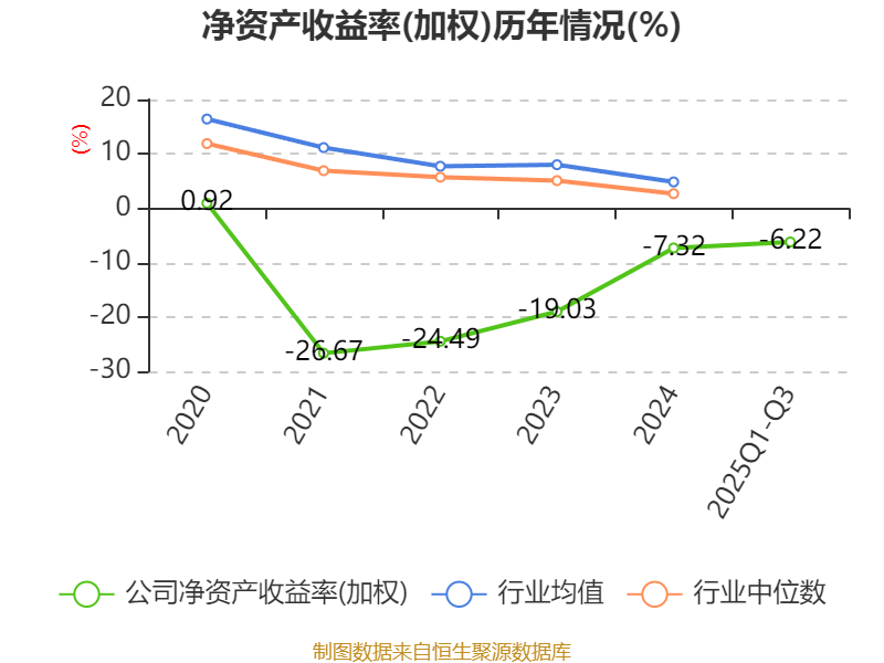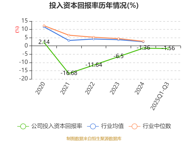 盈利能力方面, 2025年前三季度公司加权平均净资产收益率为-6.22%,同比上升1.57个百分点。公司2025年前三季度投入资本回报率为-1.56%,较上年同期上升0.37个百分点。