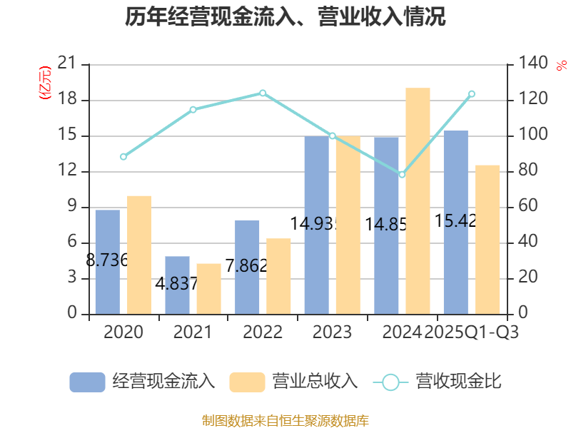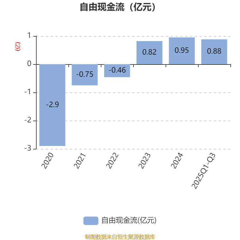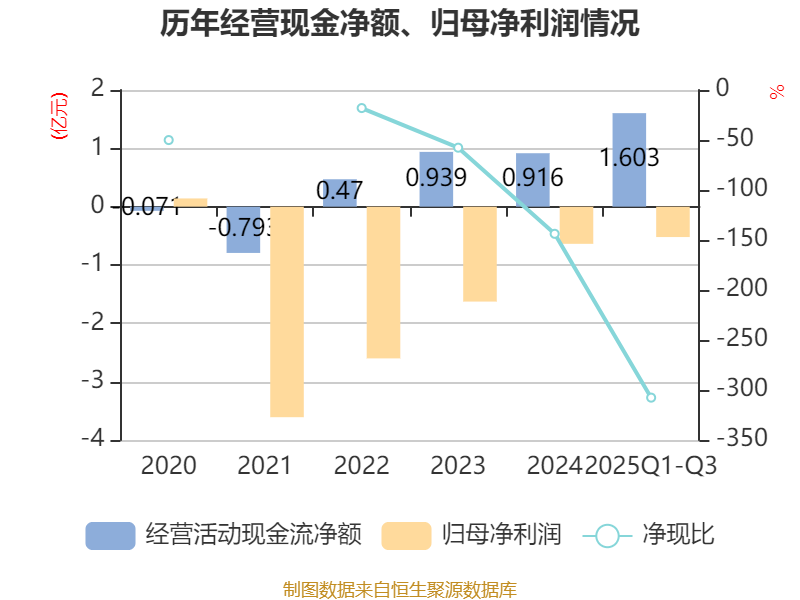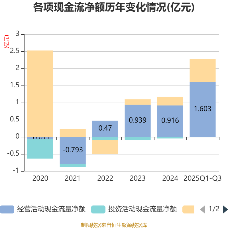 2025年前三季度,公司经营活动现金流净额为1.6亿元,同比增长124.96%;筹资活动现金流净额6763.08万元,同比减少1020.31万元;投资活动现金流净额-139.8万元,上年同期为-284.21万元。