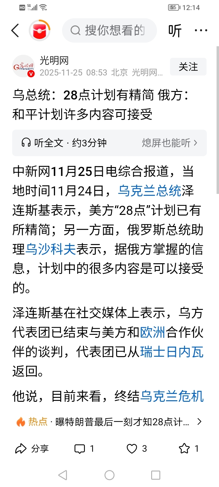 乌克兰总统泽连斯基表示,美方“28点”计划已有所精简;另一方面,俄罗斯总统助理乌