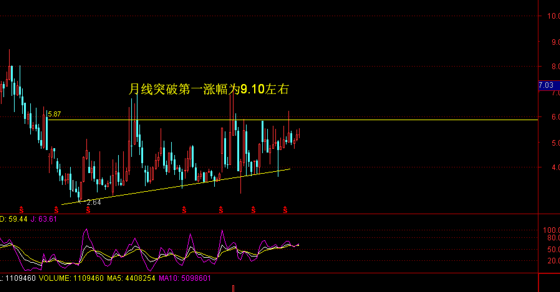 从月线来讲,月线是以三角形的底部作基础的,月线看得更明白,更清楚,7年时间,对于一只小盘个股来讲,时间是差不多的…你既然买了这只股,多点耐心,多点包容心,很多创业板的个股都是用了5-7年时间向上突破的,我的上支股票云意电气,也是在底部徘徊了7年,在今年7月份向上突破7.6一线上去的,过去那7年也是在7块到3块之间不断徘徊,横盘用了7年时间,还有一个股票叫中元股份,也是用了7年时间,就在不久前向上突破9.2一线,而且现在涨得还不多,有兴趣可以去试试