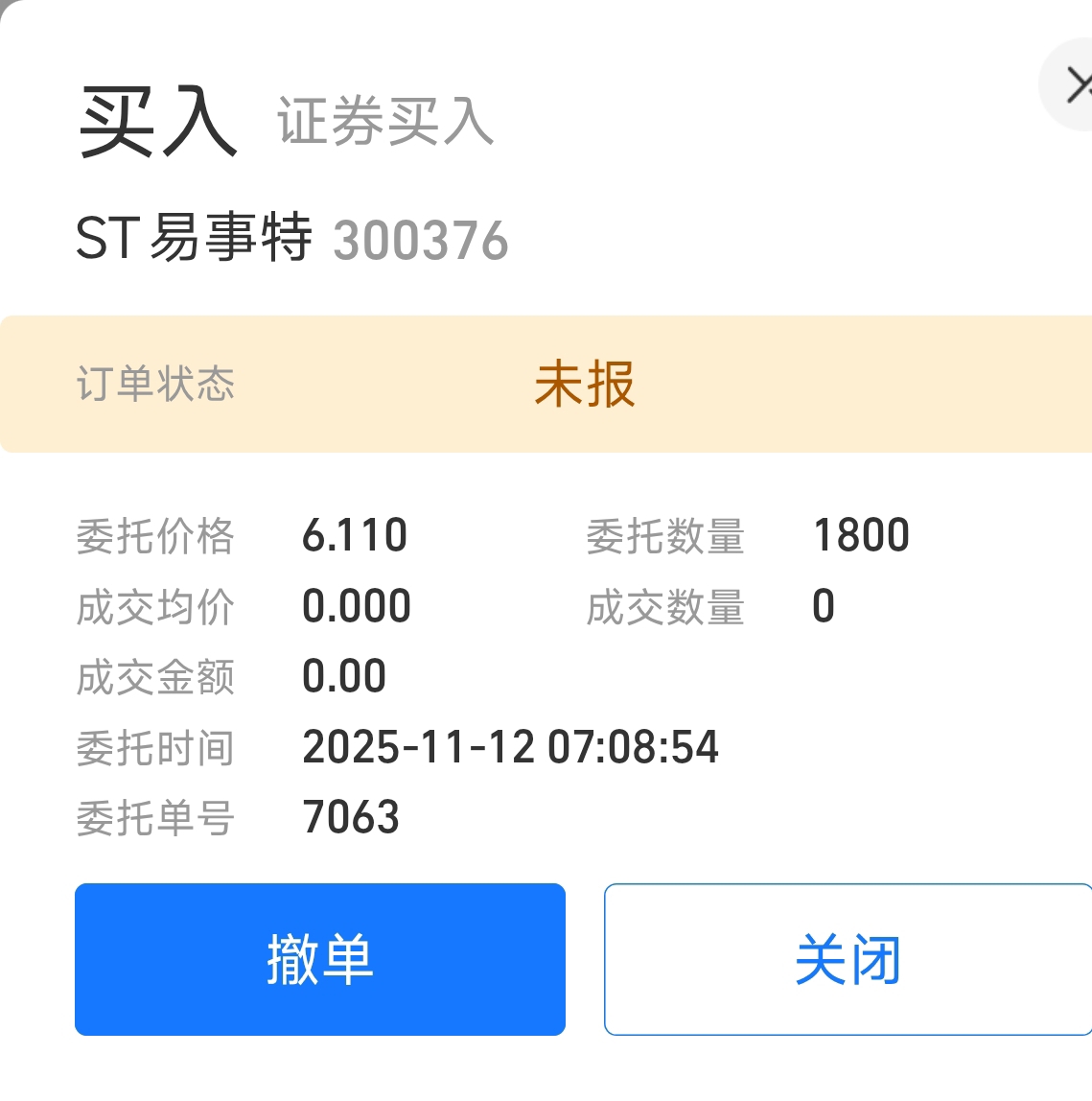 $ST易事特(SZ300376)$ 已经挂单1800股,大概金额11000元。仅供参考