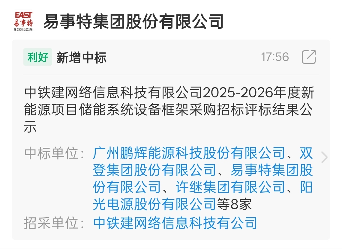 重大利好!明天涨停!易事特中标中国铁建项目!不管金额多否,但,意义重大!与阳光电