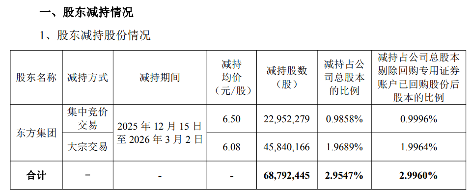 公告显示,2026年3月3日,公司收到东方集团出具的《关于股份减持计划实施进展暨提前终止的告知函》,自2025年12月15日至2026年3月2日期间,东方集团已累计减持68,792,445股,其决定提前终止本次减持计划,未完成减持的股份在减持计划期间内将不再减持。