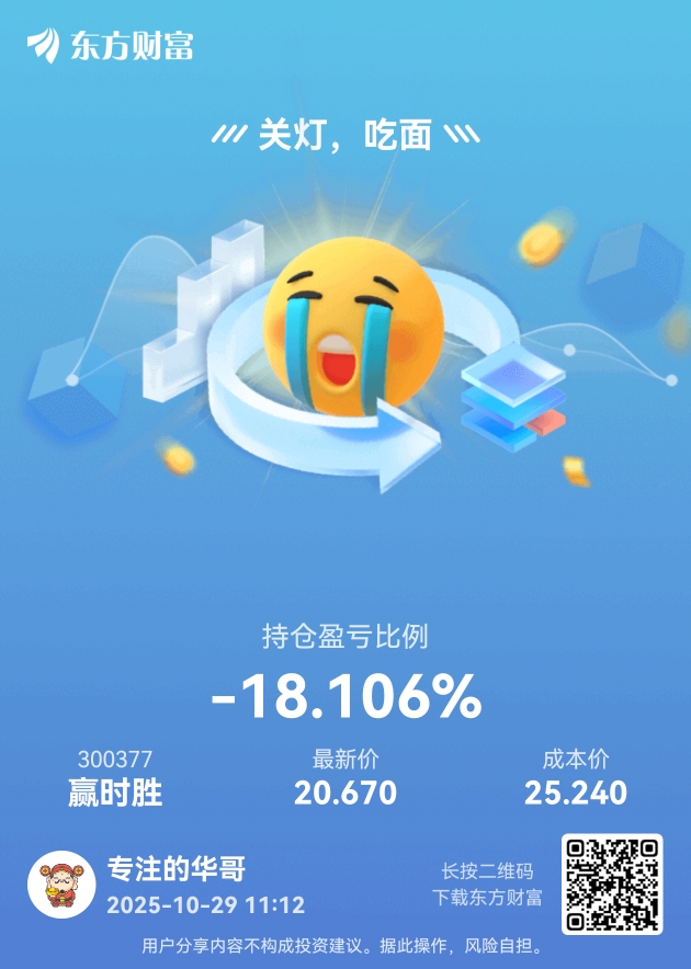 $赢时胜(SZ300377)$ 涨一分钱跌4毛,这涨了4毛不得跌2块6啊,咋办啊
