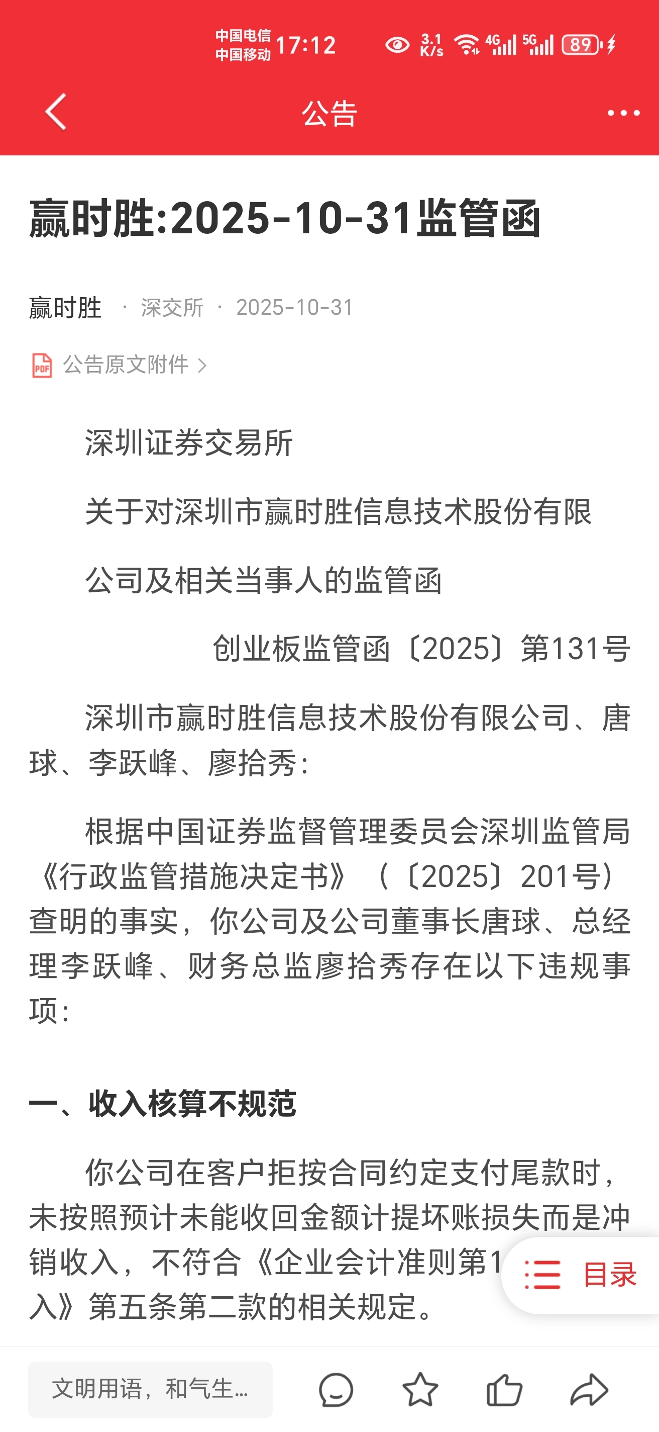 $赢时胜(SZ300377)$ 今天缩量上涨,收盘发监管函,周一危险喽