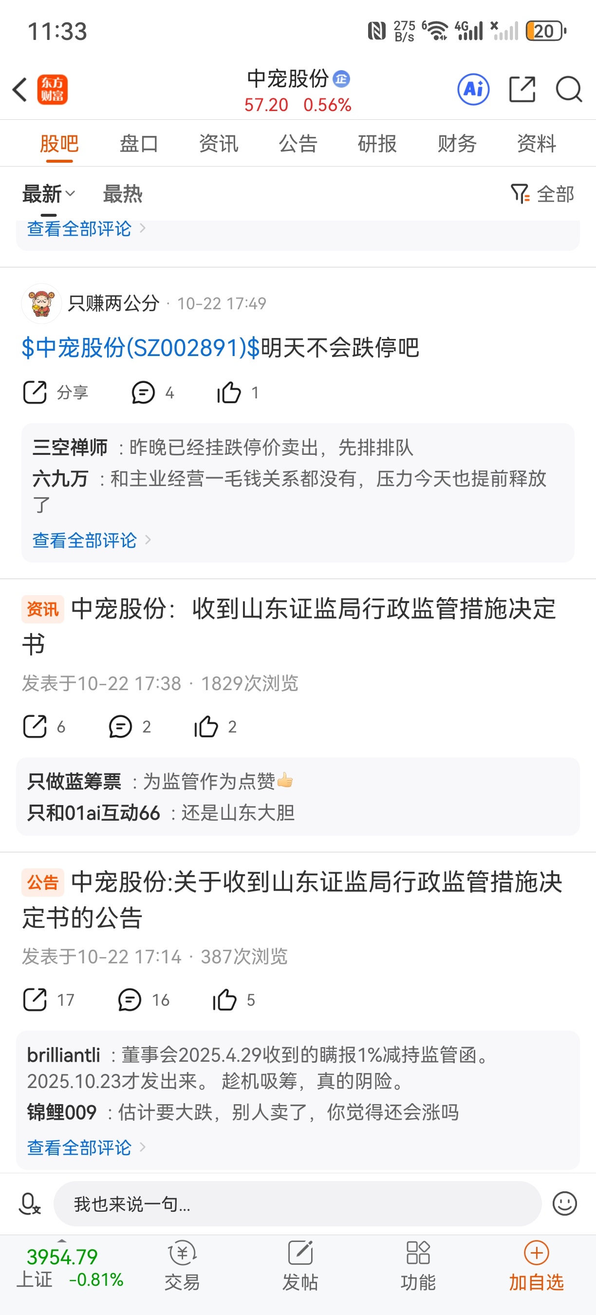 本月23号中宠股份的行政监管措施书,在日线本就调整的过程中第二天微跌两三个点,看
